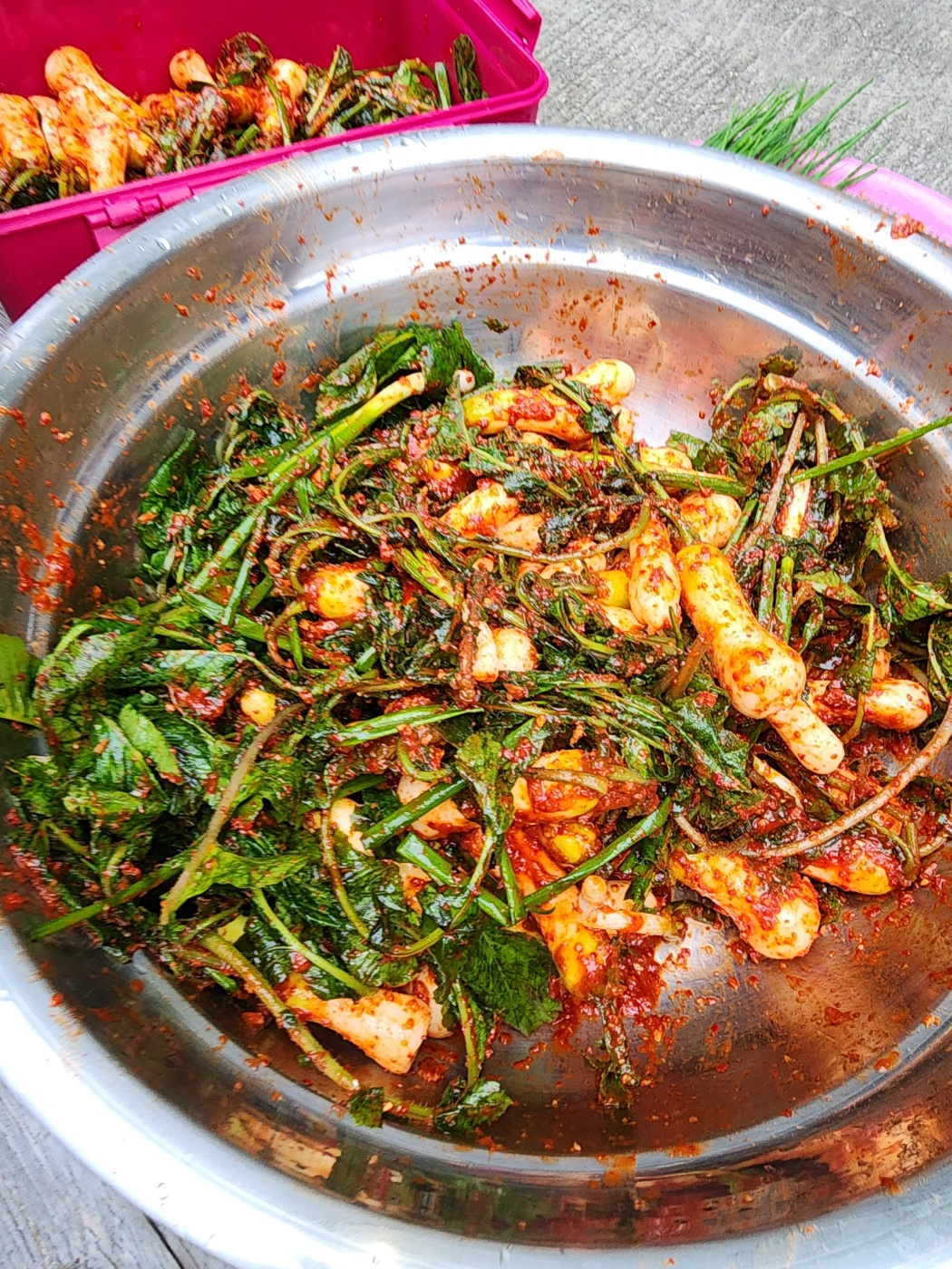 토종총각무도 버물릴 땐 조금씩 쪽파를 넣고 한국자씩 떠서 버무려요 한쪽으로 밀어놓고 버무리면 골고루