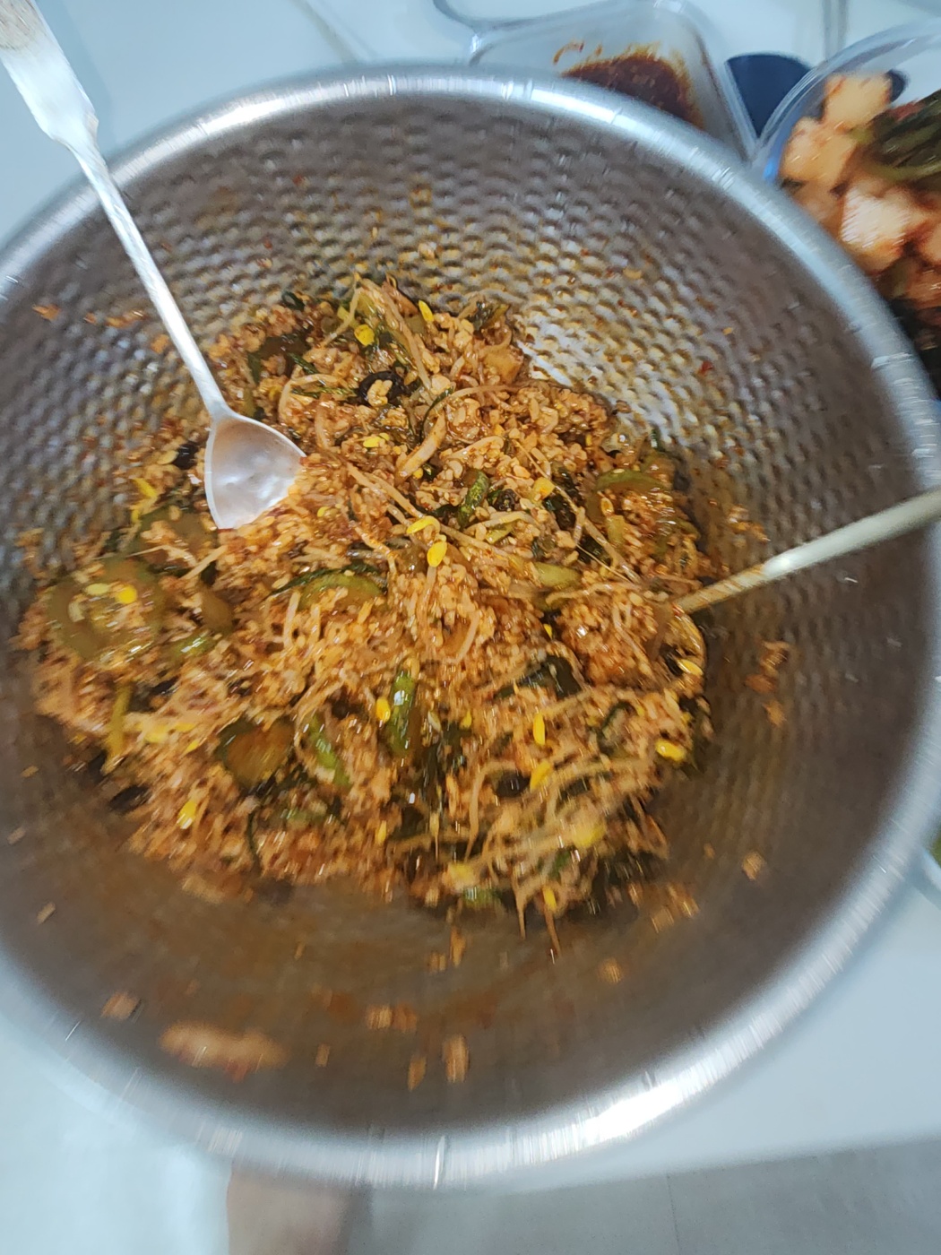 잘 익은 총각김치와 오이무침과 콩장을 넣고 고추장을 한 수저 넣고 참기름과 들기름을 동시에 넣고