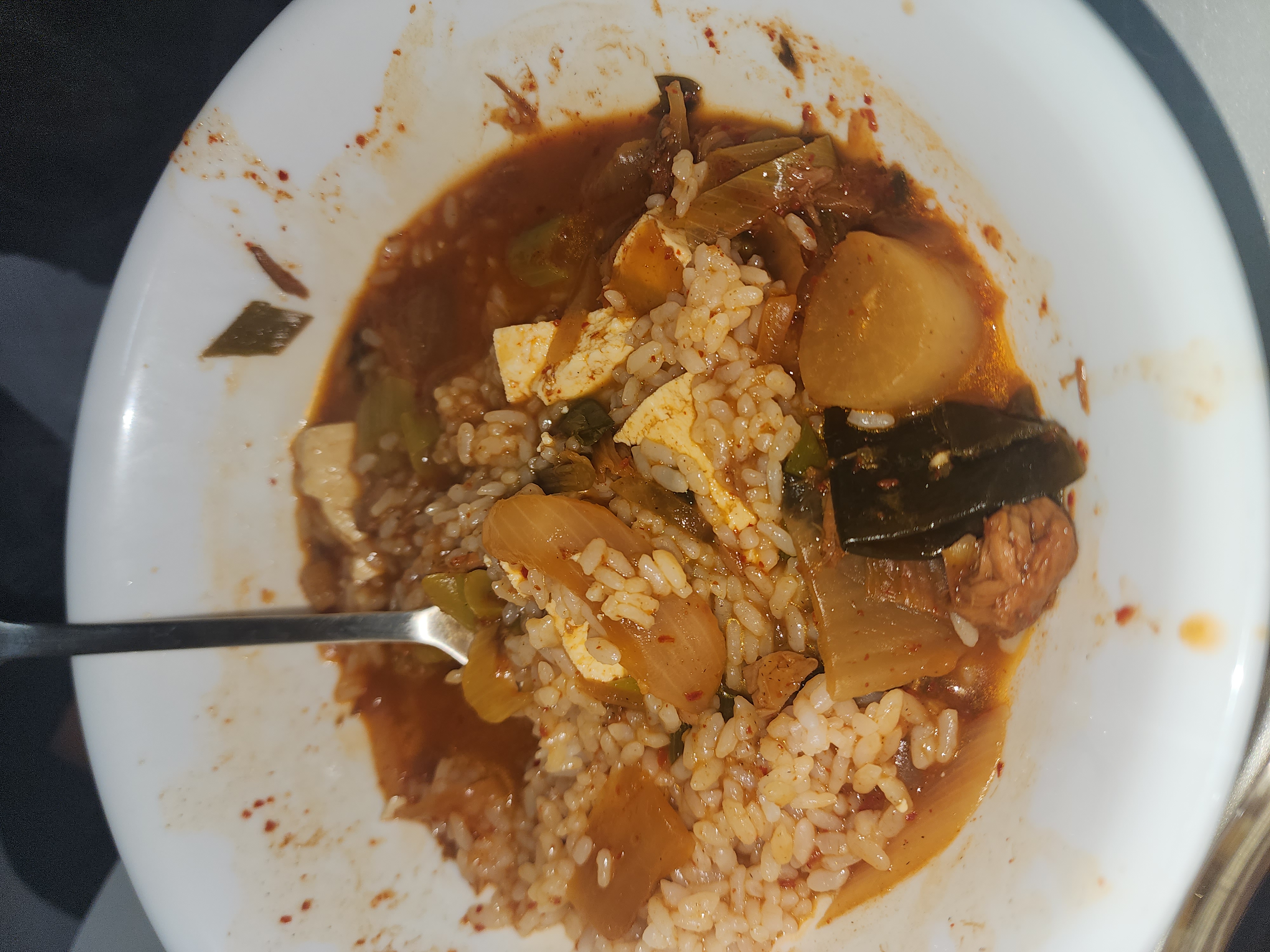 김치찌개 그릇에 밥을 넣어서 김치찌개를 더 넣어주었다