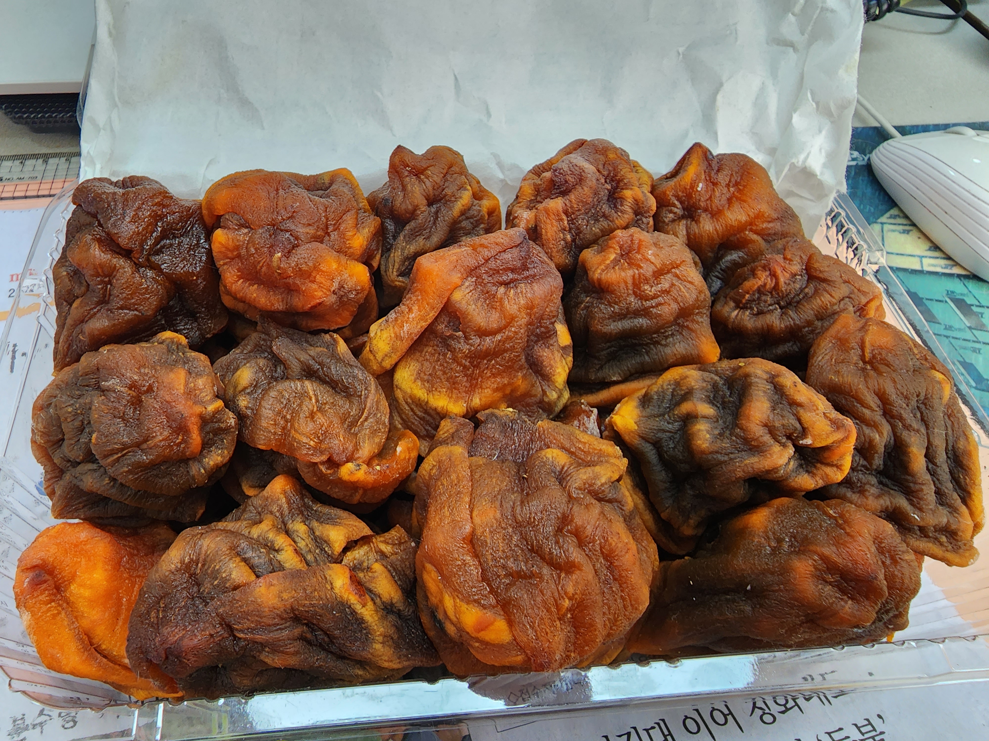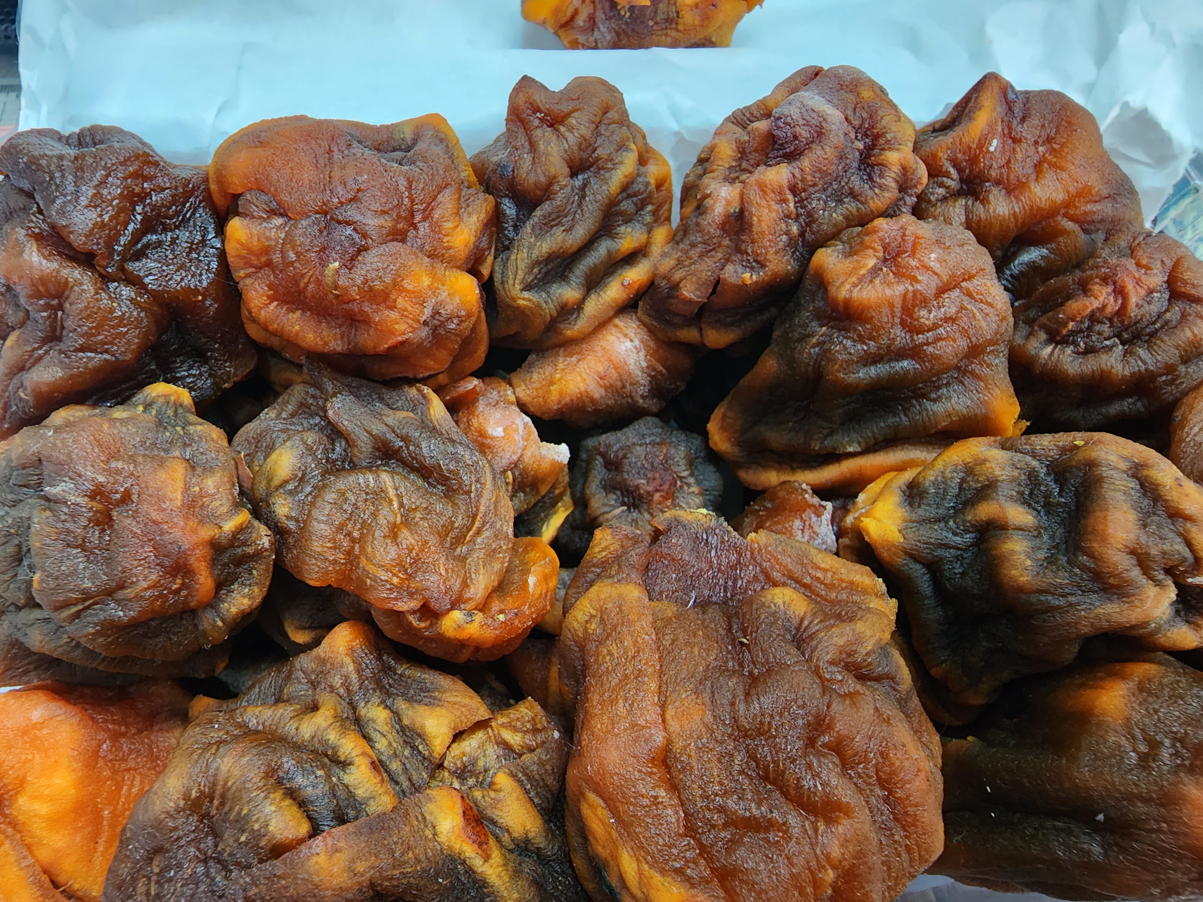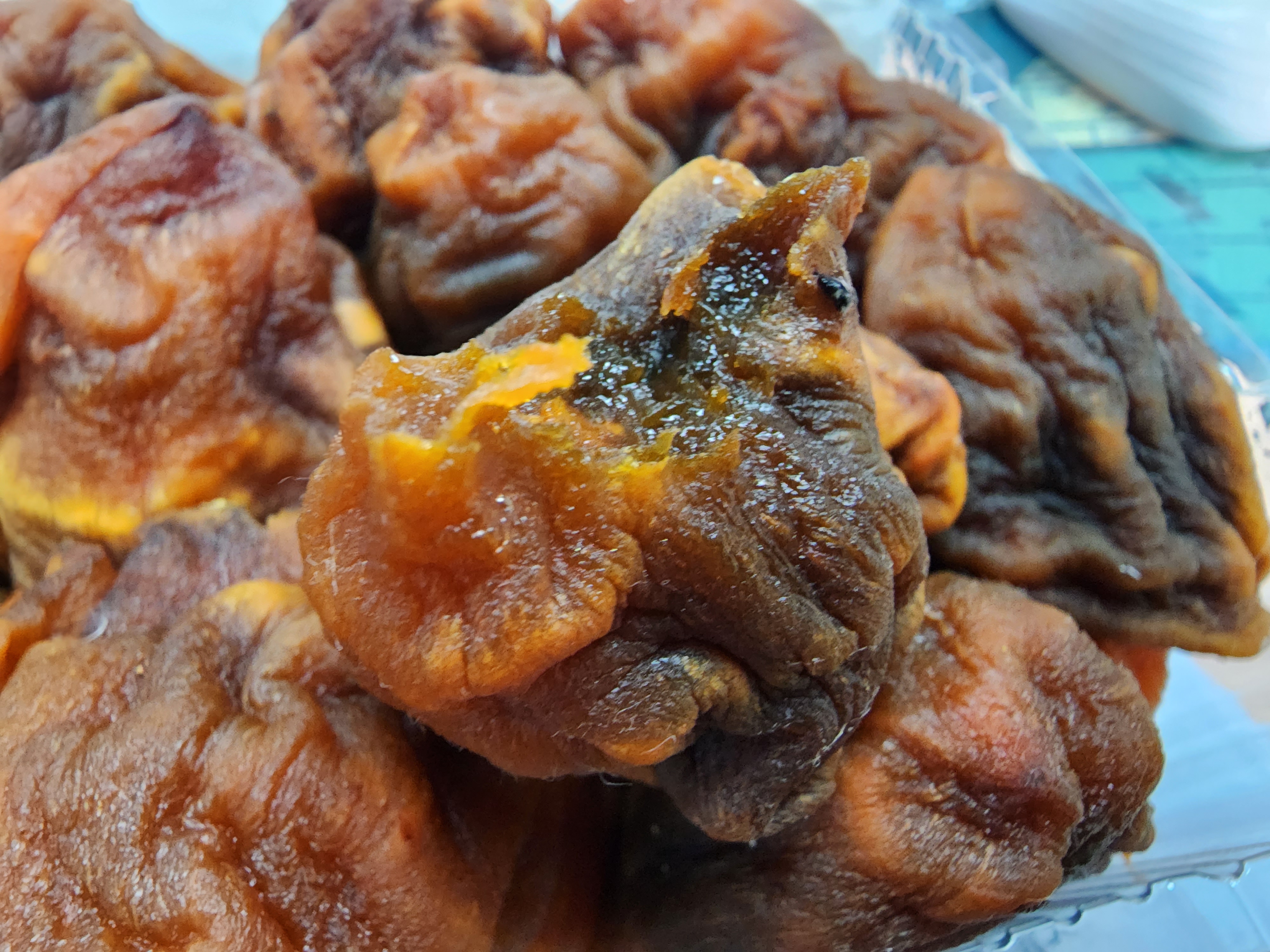 깨끗하게 말린 곳감 대봉감으로 말린 것 같다 너무 커서 반으로 자른 것도 있고 큰 거 하나를 다 넣은 것도 있고