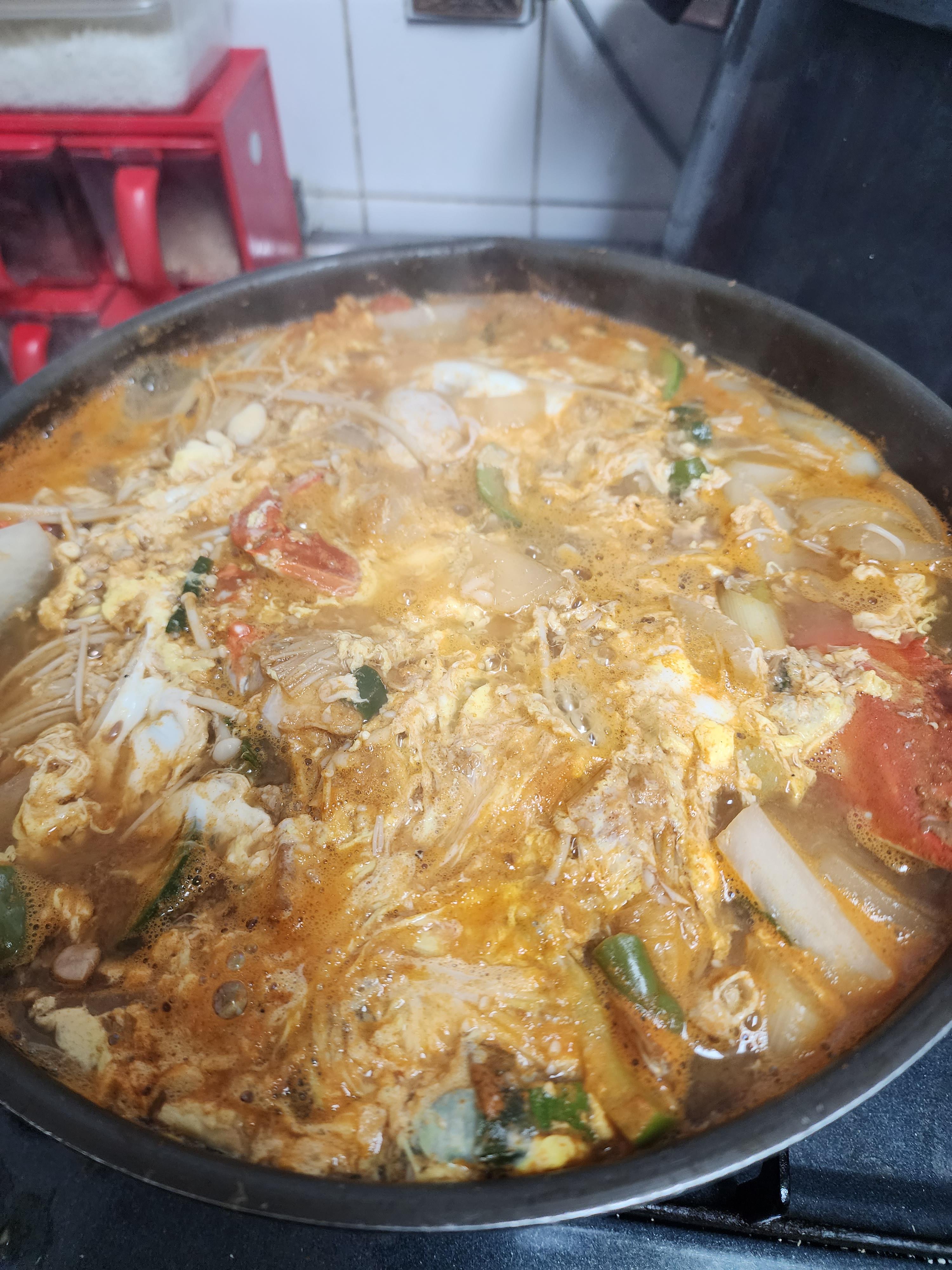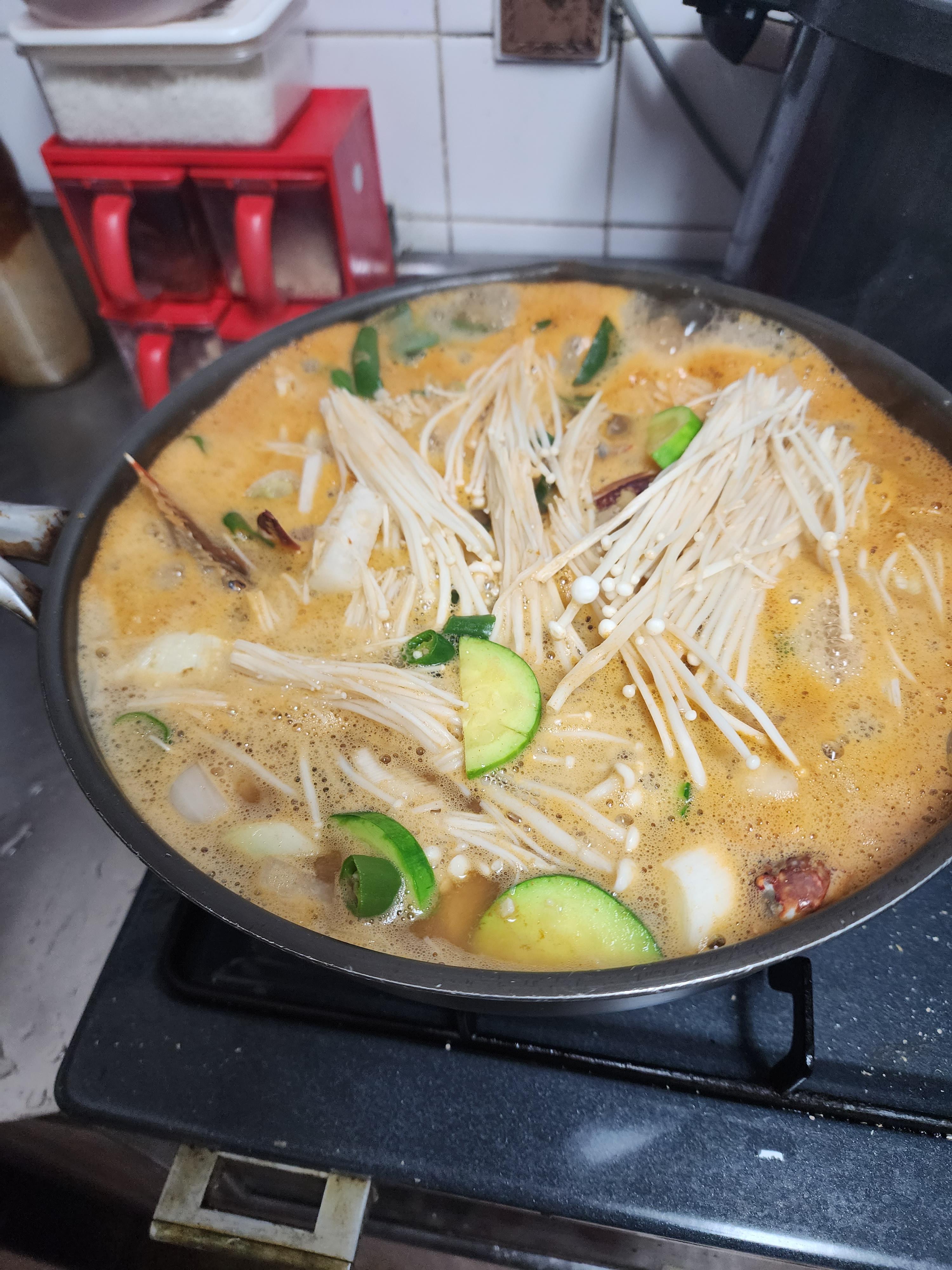 된장고추장 파마늘 양파 호박 고추등을 넣고 팽이버섯 마지막 계란도 풀어서 넣었다