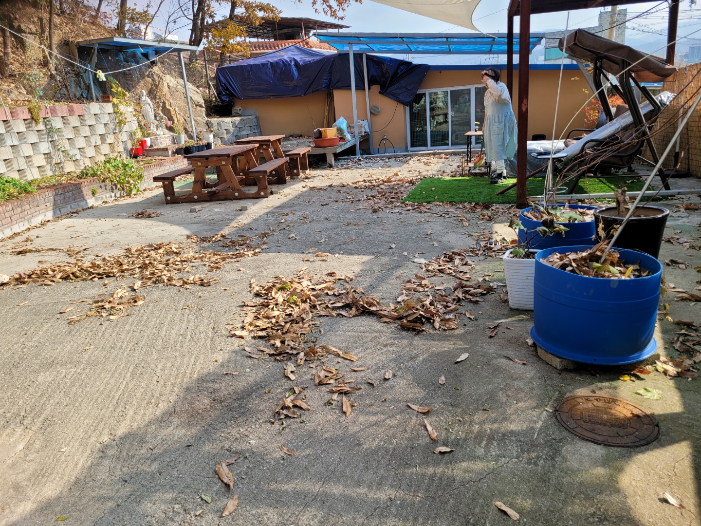 마당이 낙엽으로 가득 차면 엄청 지저분해 보이고 정신이 없어서 우린 무조건 가기만 하면 낙엽을 쓴다