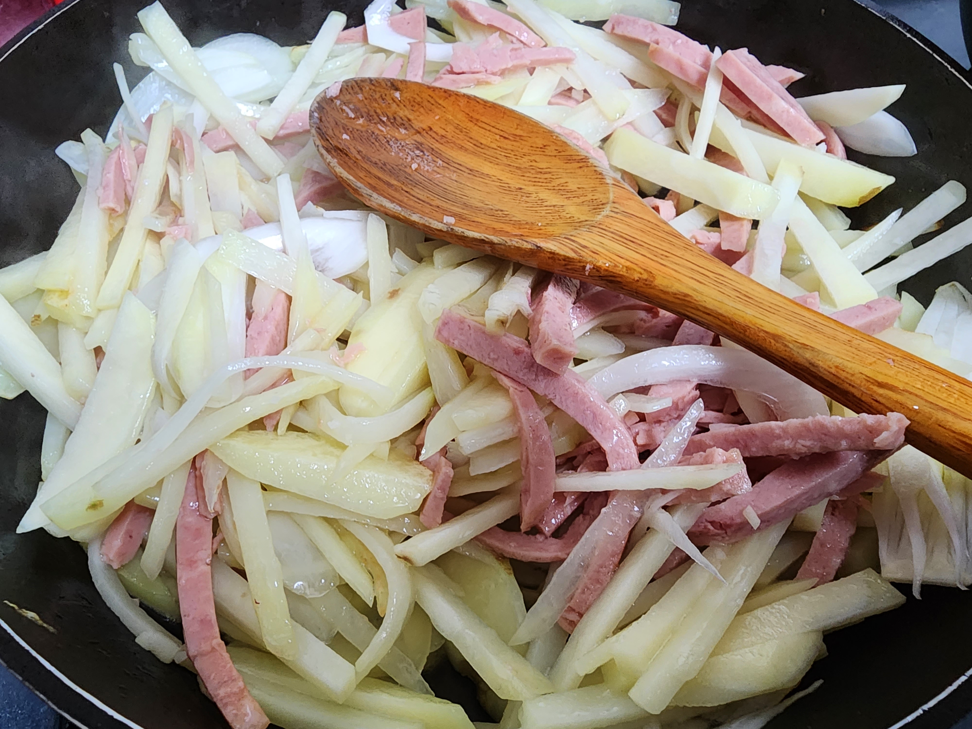 난 큰 감자세덩이를 빨리 깎고 채를 썰었다 프라이팬에 기름을 붓고 볶는다