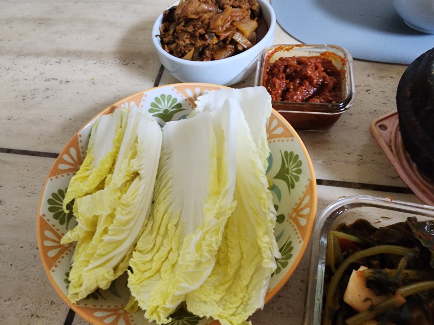 멸치가 듬성듬성보이는 된장찌개와 알배기쌈을 매실쌈장에 찍어 먹는 맛 고소한 배추가 제할일을 다한다