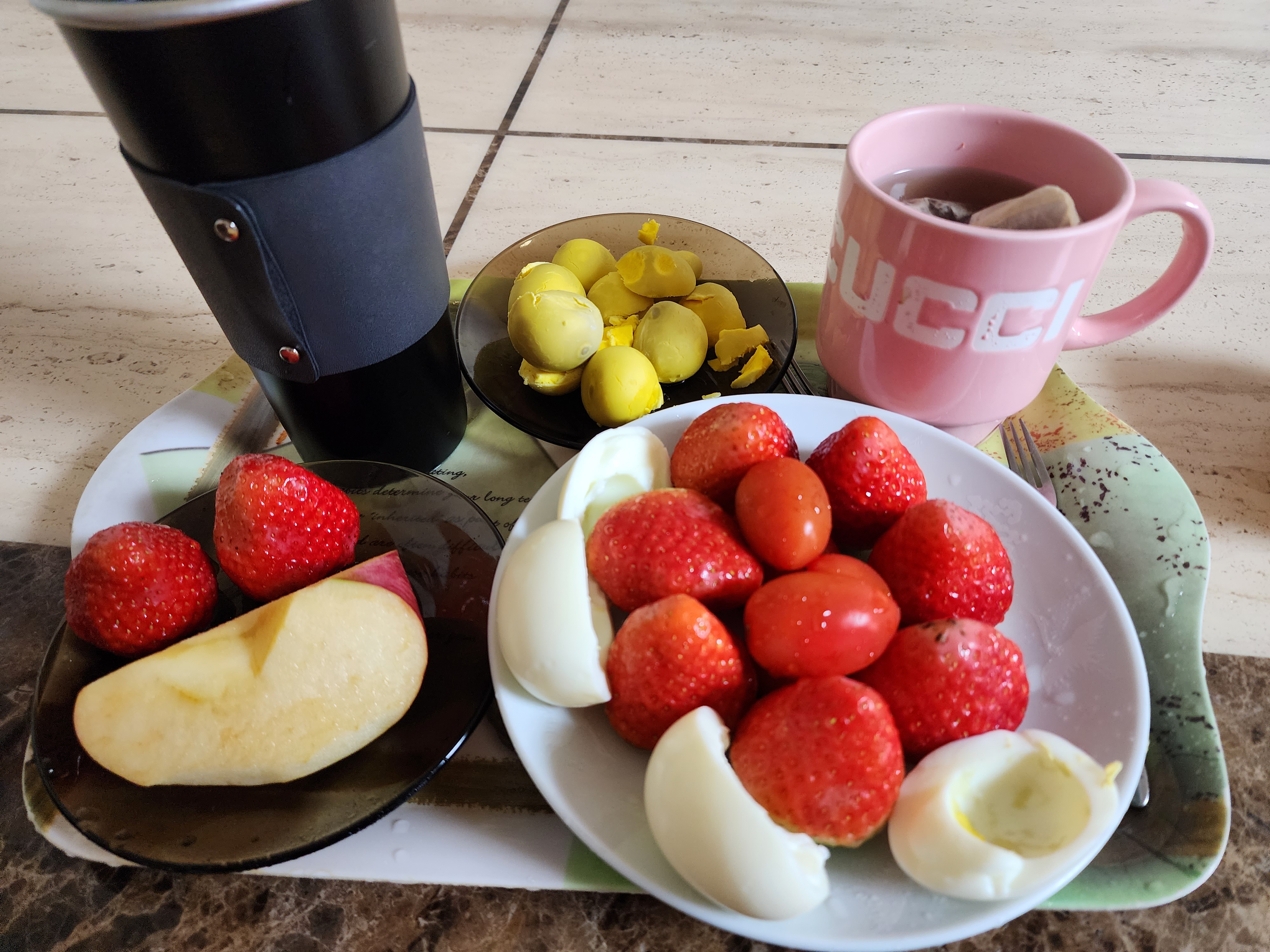 For my husband, a piece of apple, two strawberries, and 10 egg yolks. Lunch is rice cake dumpling soup.