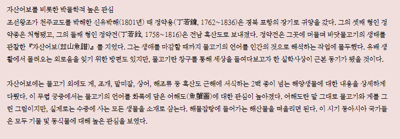 회화로 흑백으로 나오는 자산어보는 귀향가신정약용께서 외로움을 잊기위한방편이기도 하지만