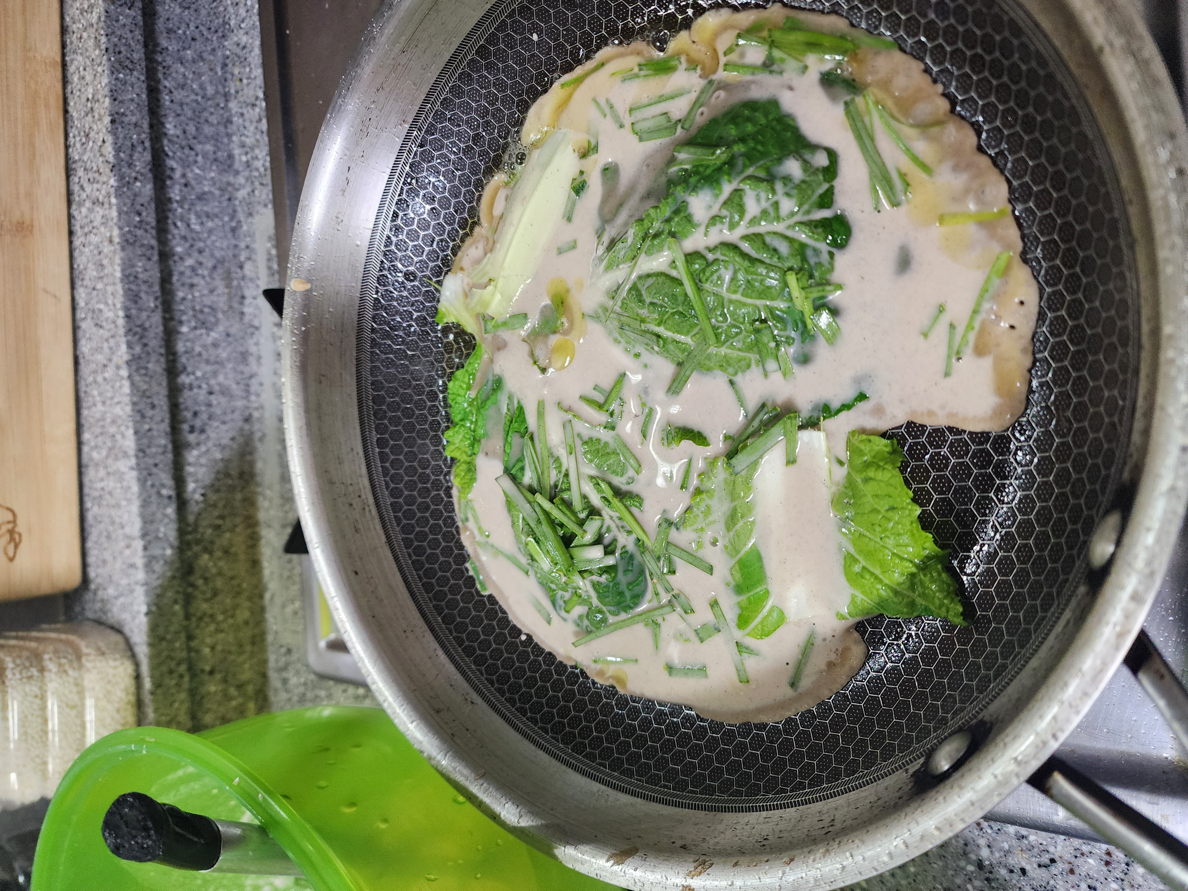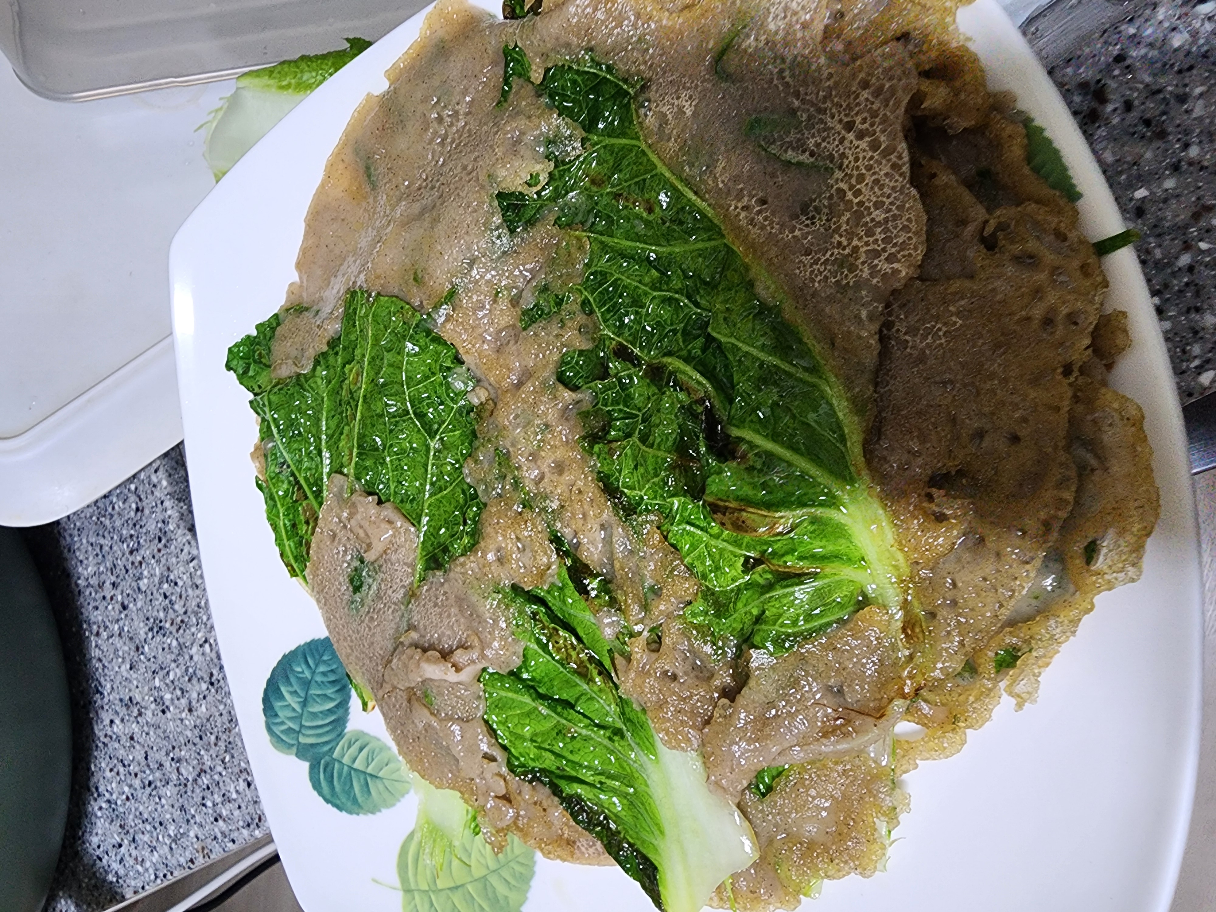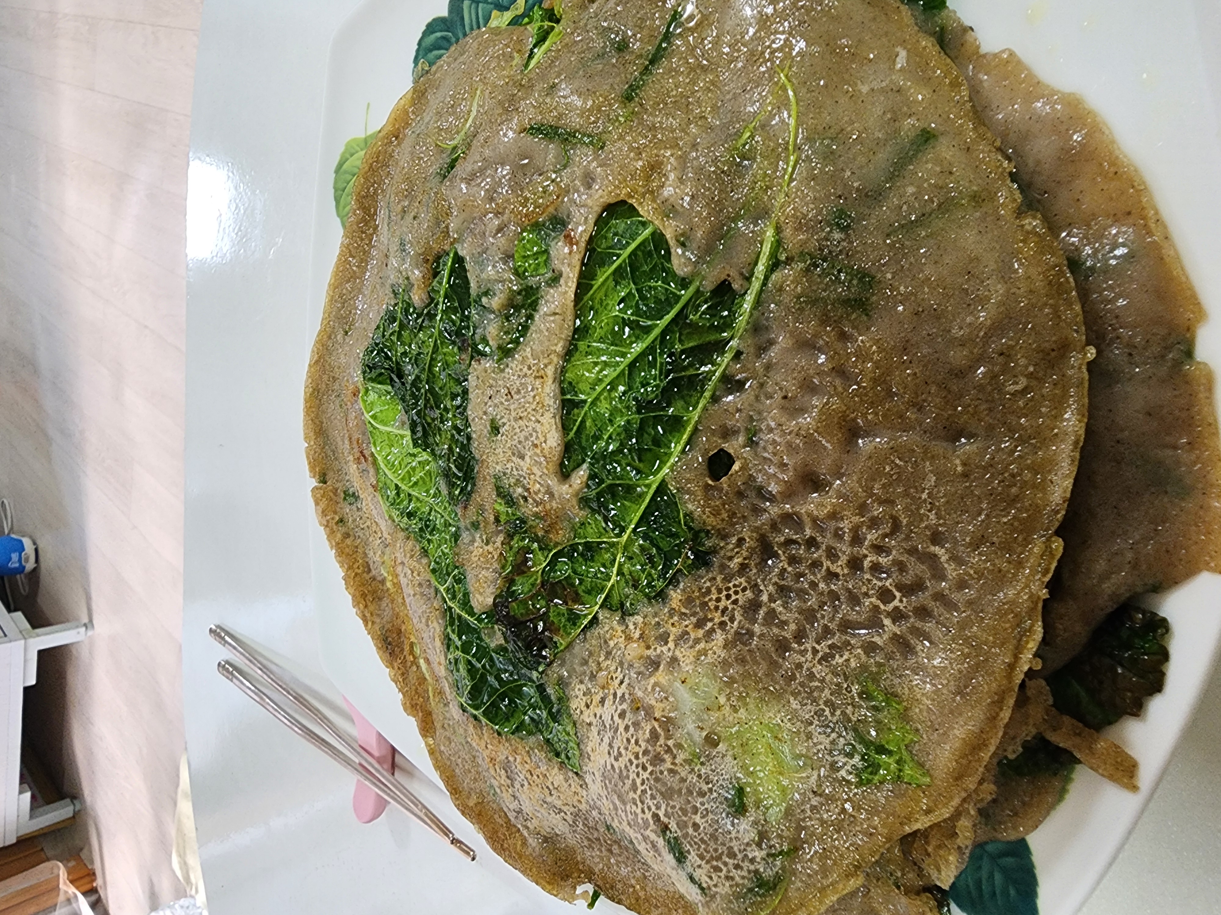 거품기로 메밀을 물에 개어 올리브유와 들기름을 올리고 배추를 지져서 올리고 그 위에 메밀을