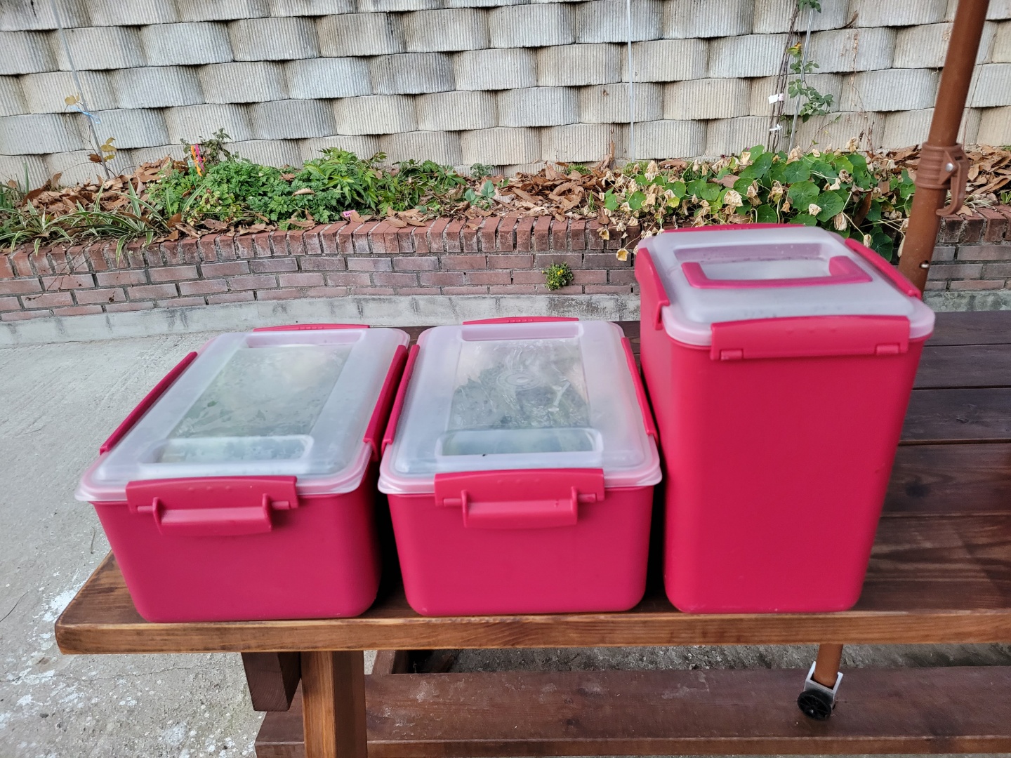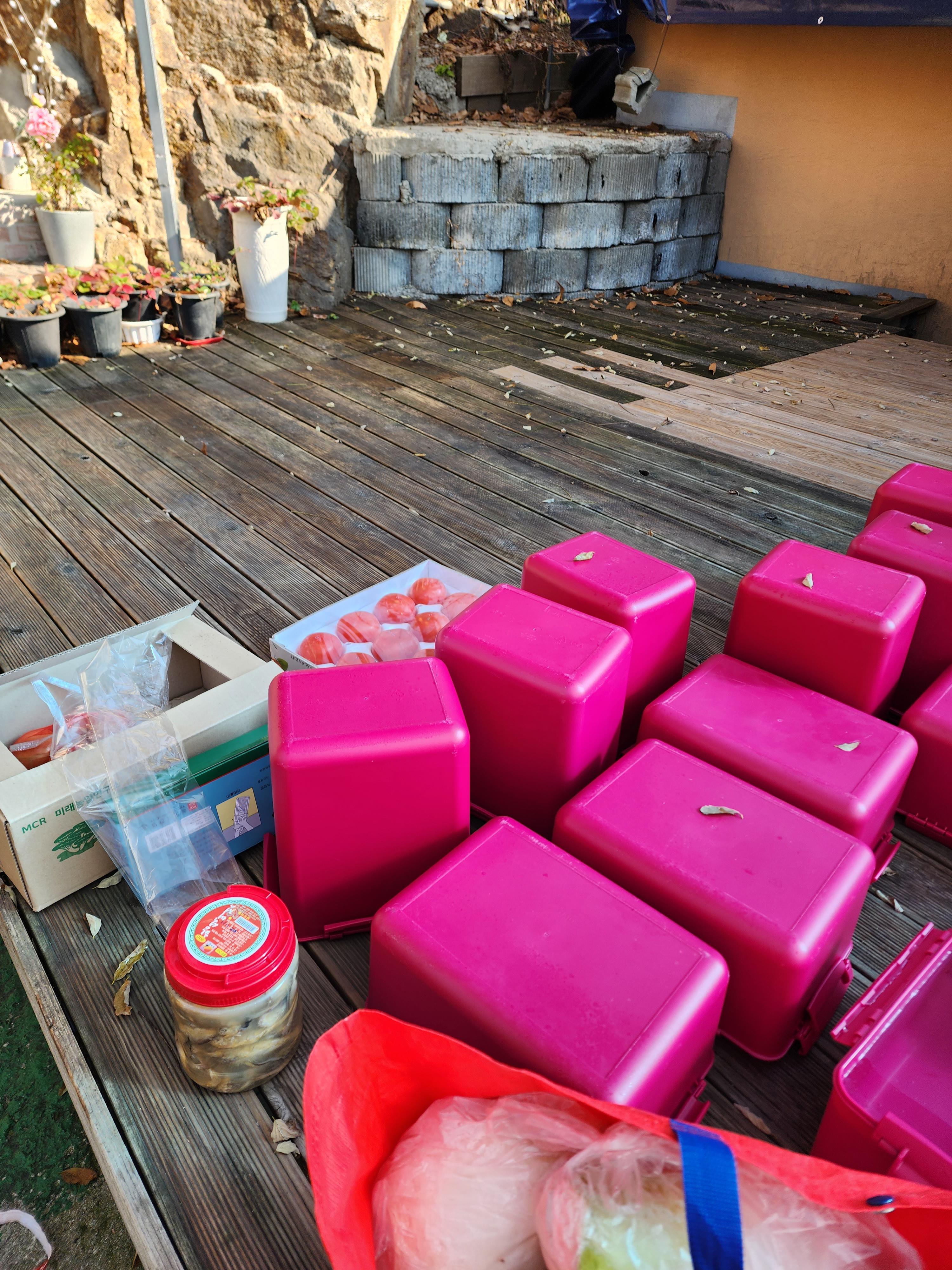 어제 씻어놓은 김치통들 김치통 색깔이 예쁘다 우린 처음 주말 집에서 김장을 우리끼리는 처음 담는다