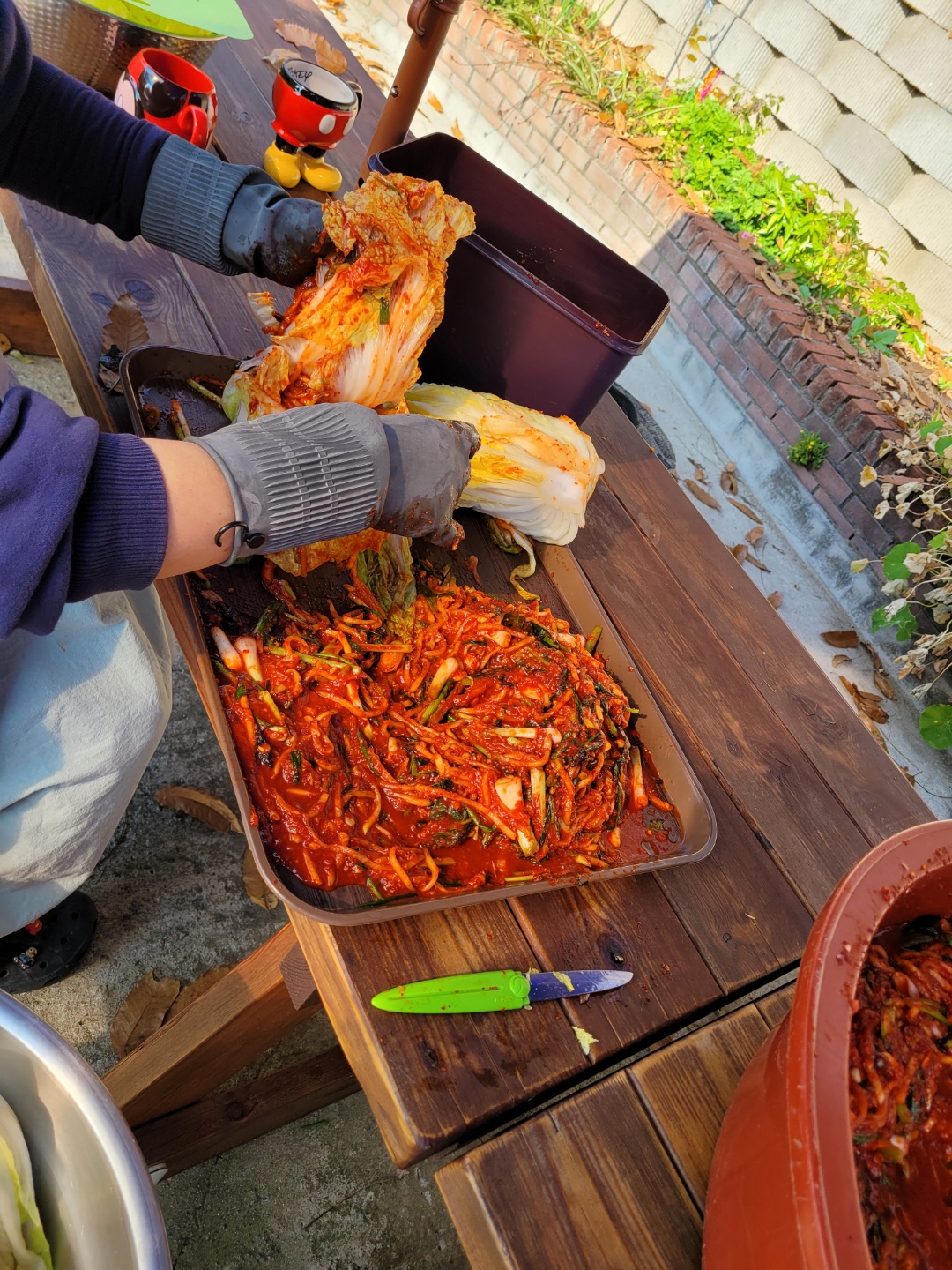속을 묻히어 잘 감싸서 김치통에 한 포기 한 포기 넣으면 된다 남편은 김치통을 가져다주고 속을 떠주고 김치통을 닫고
