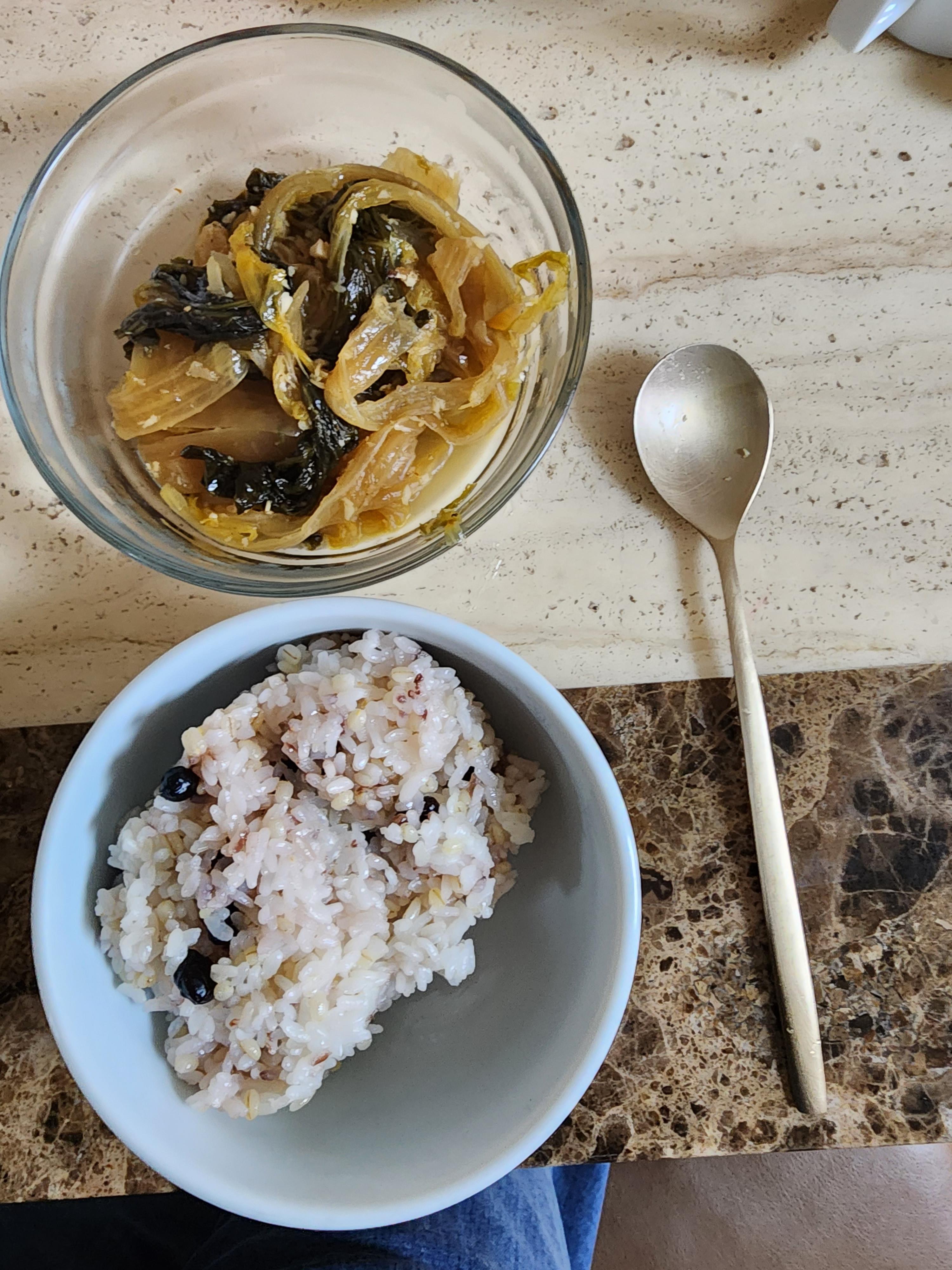 밥도 잘됐다 콩도 잘 익고 구수한 밥냄새가 묵은지볶음과 환상의 콜라보를 연출한다