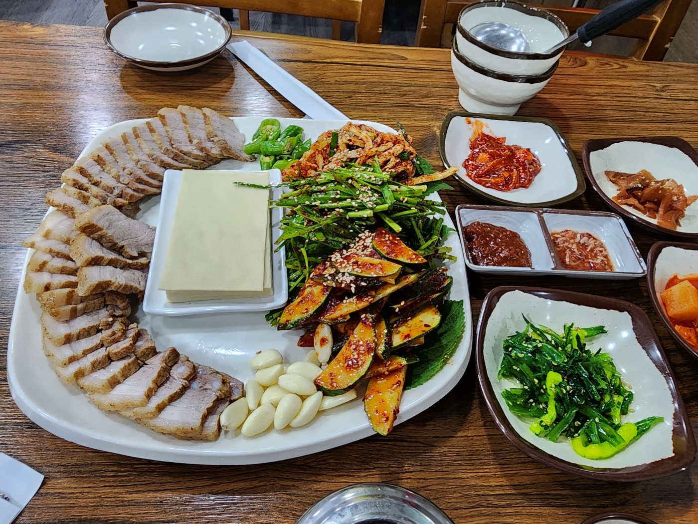 부들부들한 수육 지방과 살코기가 조화롭게 배합된 고기와 참기름에 무친 부추무침과 오이무침 무말랭이무침과 마늘 고추 그리고