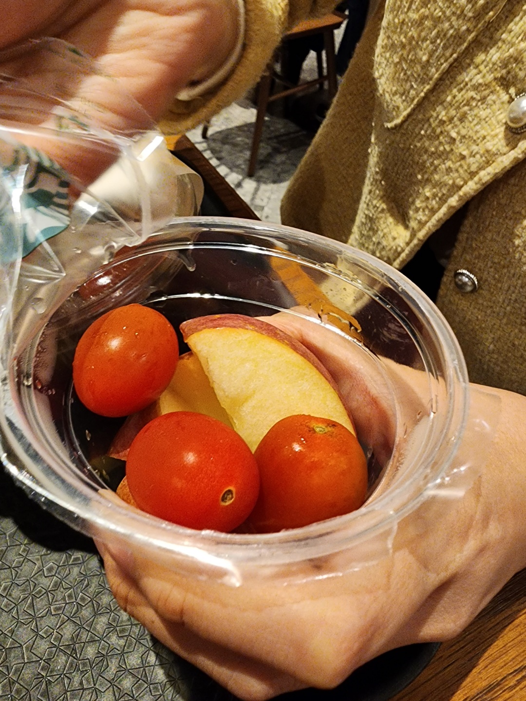 사과와 방울토마토가 있는 과일과 닭가슴살 샐러드도 같이 먹었어요