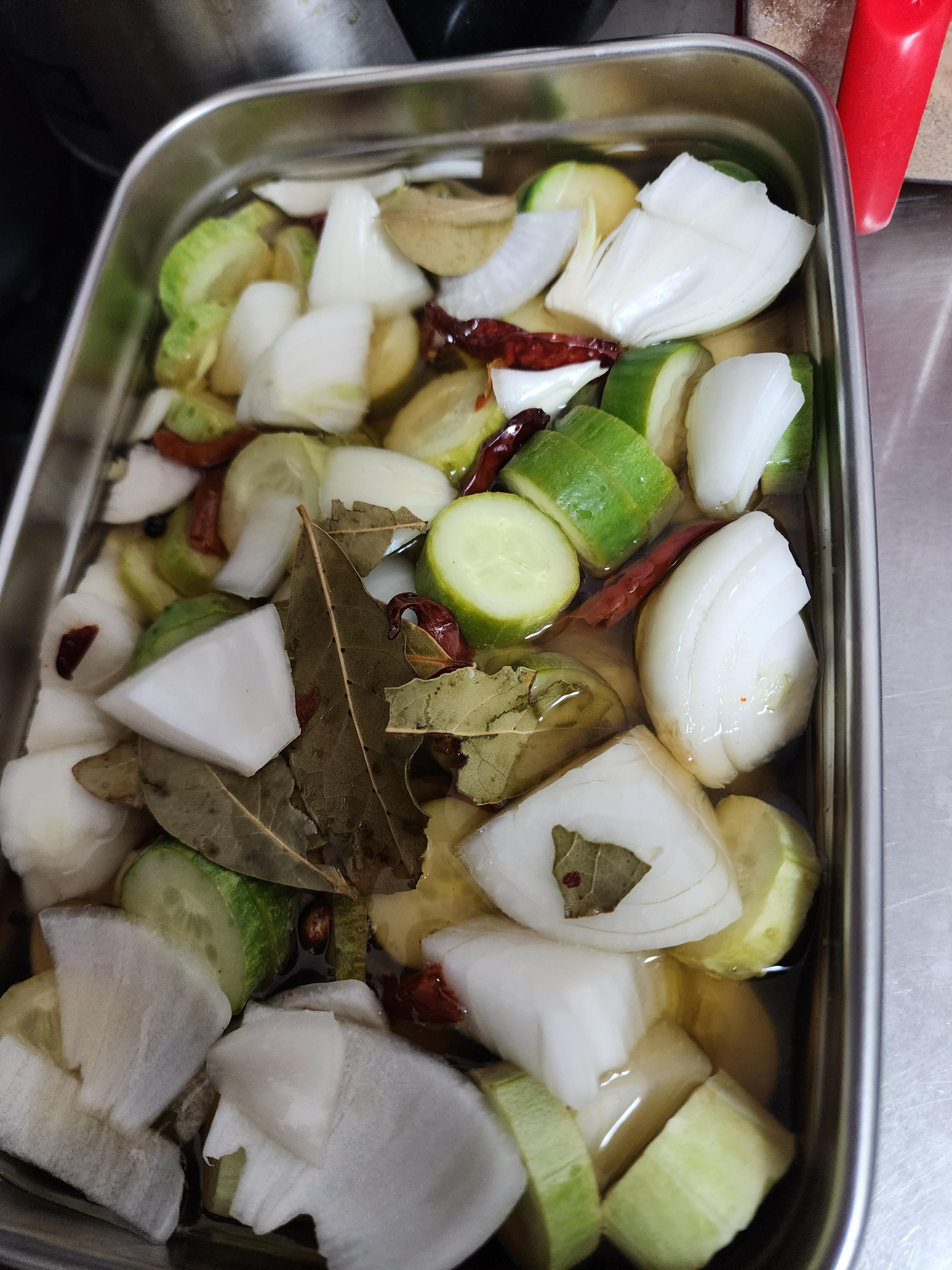 무 양파 오이 ㅎㅎ 월계수잎 몇 개 통후추 몇 알 매운 고추 몇 개 식초 2컵 물 한 컵 소금 한 수저 설탕 한 컵을 바글바글 끓여서