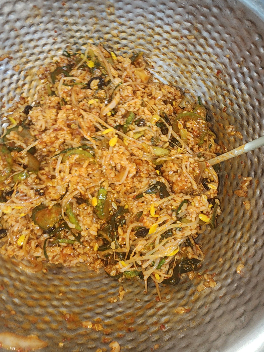 잘 익은 총각김치와 오이무침과 콩장을 넣고 고추장을 한 수저 넣고 참기름과 들기름을 동시에 넣고