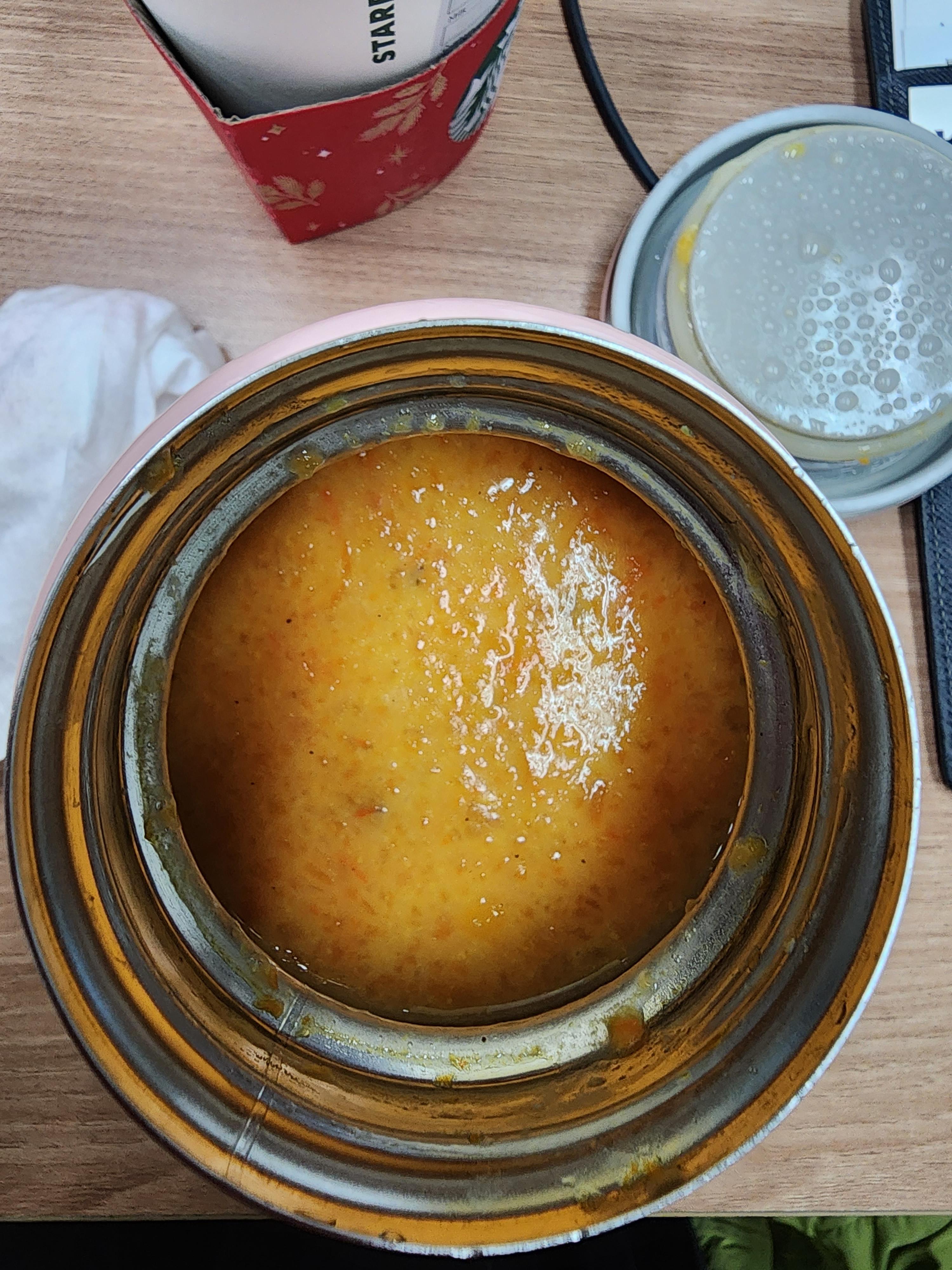 아침에 바쁘게 끓인 호박스프는 맛이 어떨지 모르나 딸아이와 내 것을 보온도시락에 담았다