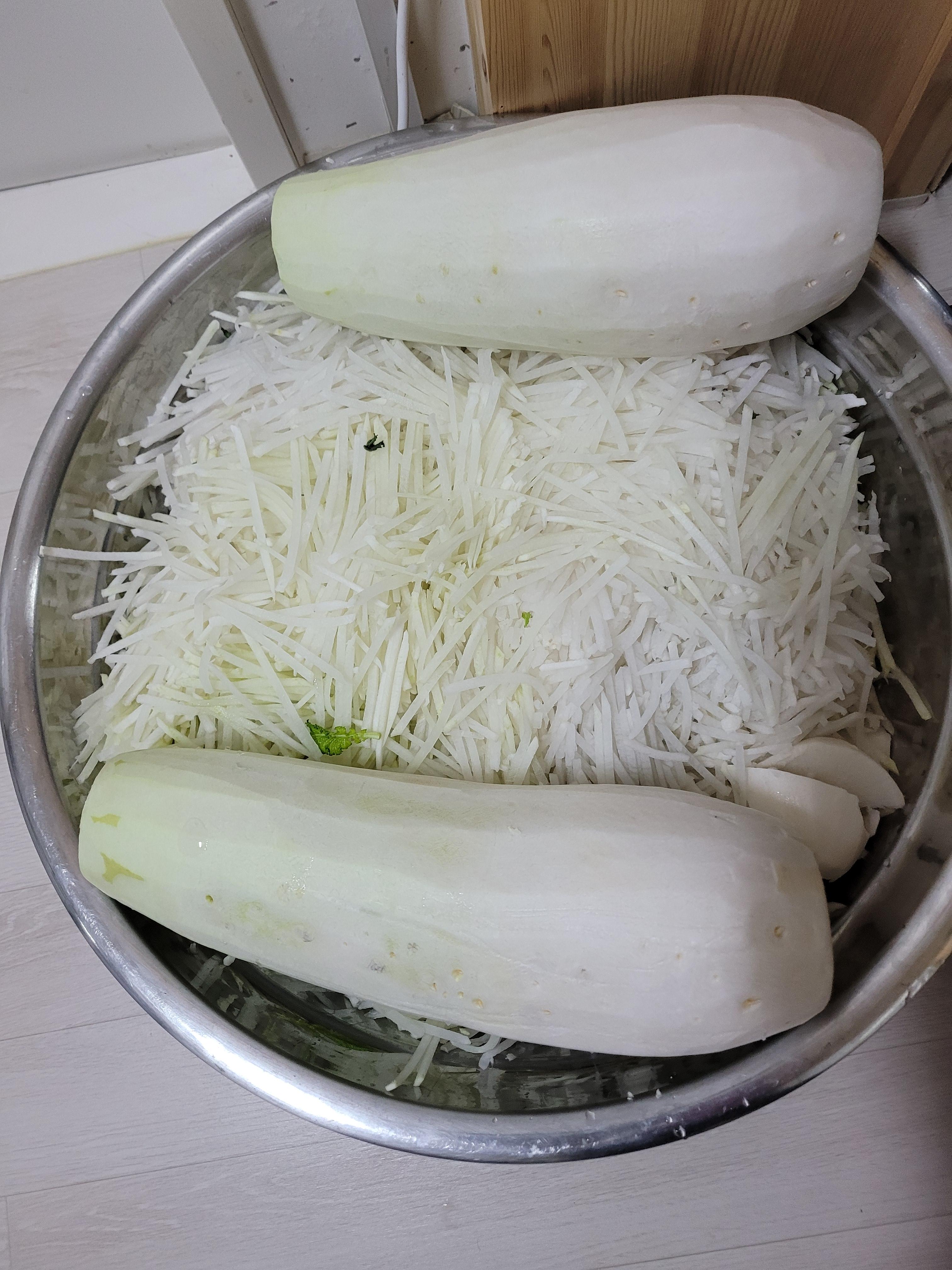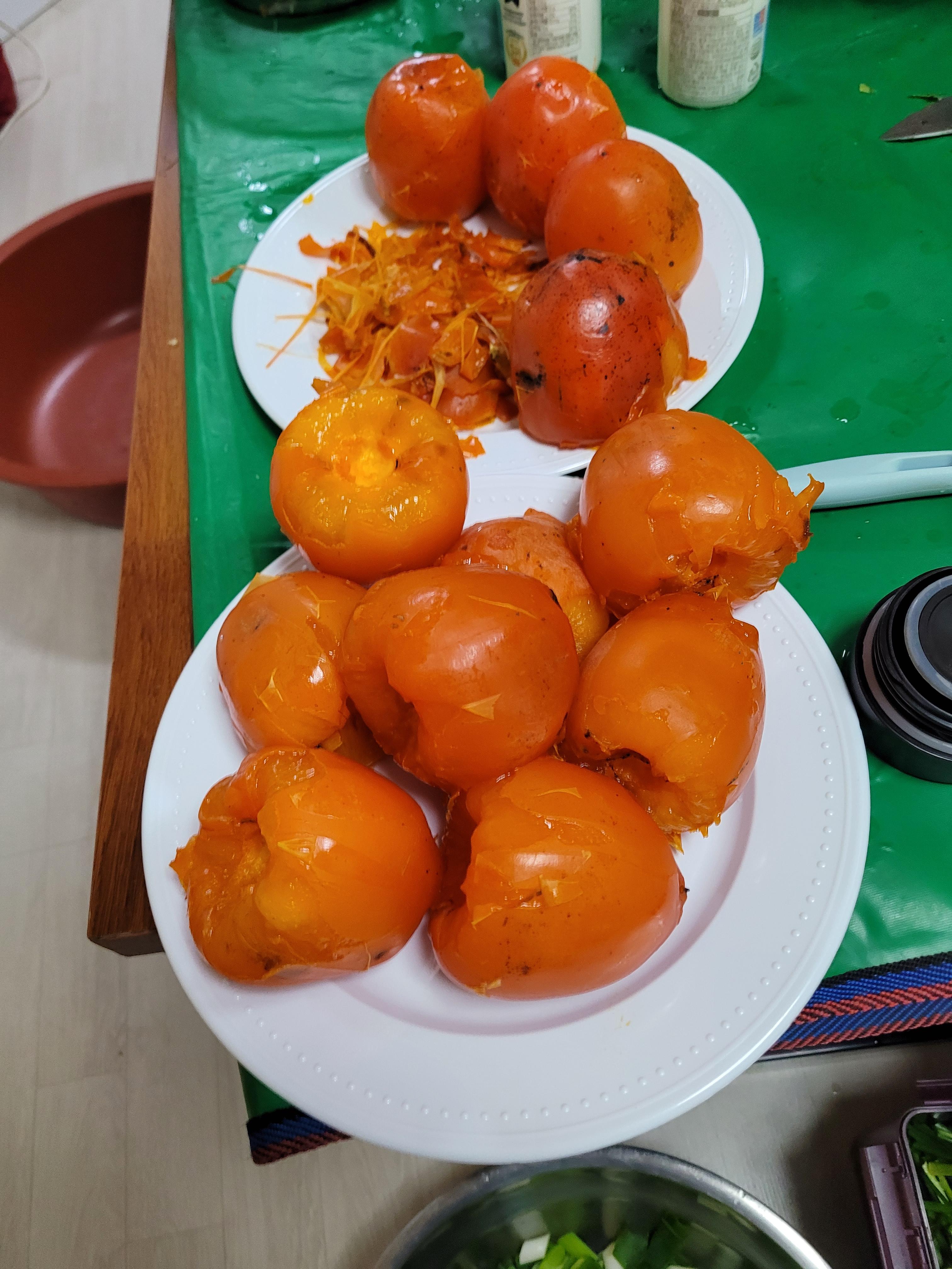 연시가 들어가서 홍시를 사다가 껍질을 까고 무를 썰고 배추를 절이고 쪽파를 까고 갓다듬고 씻고 버무리고