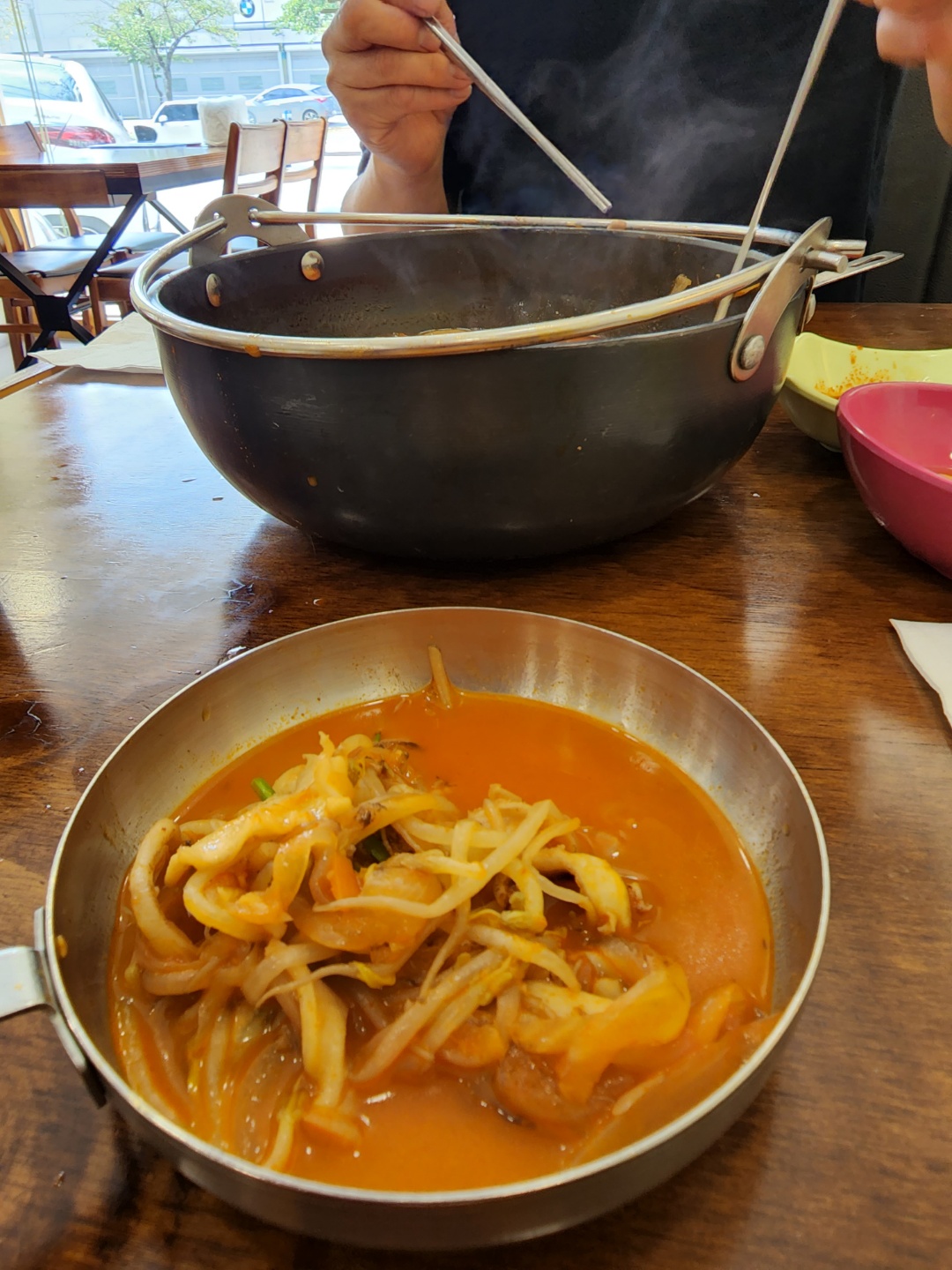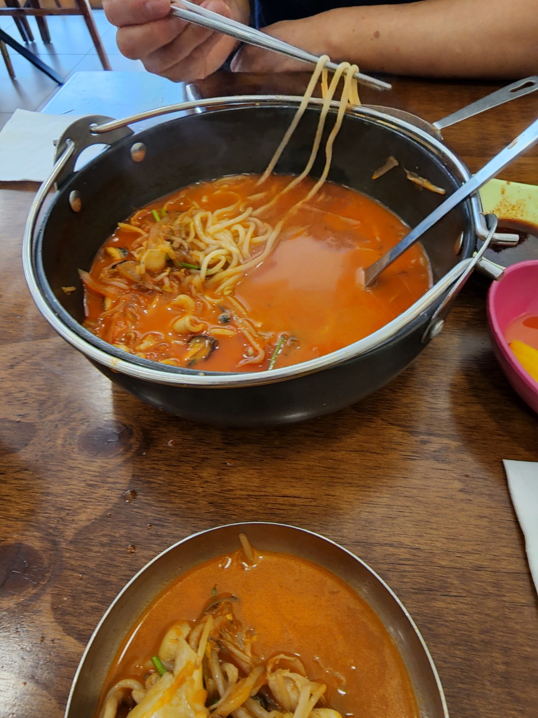 긴장한 짬뽕은 가락국수 냄비에 나왔어요 1인 분치 고는 많쵸? 곱빼기니까 국물은 아직 깊었고 해물은 고급 조개도 들었지만