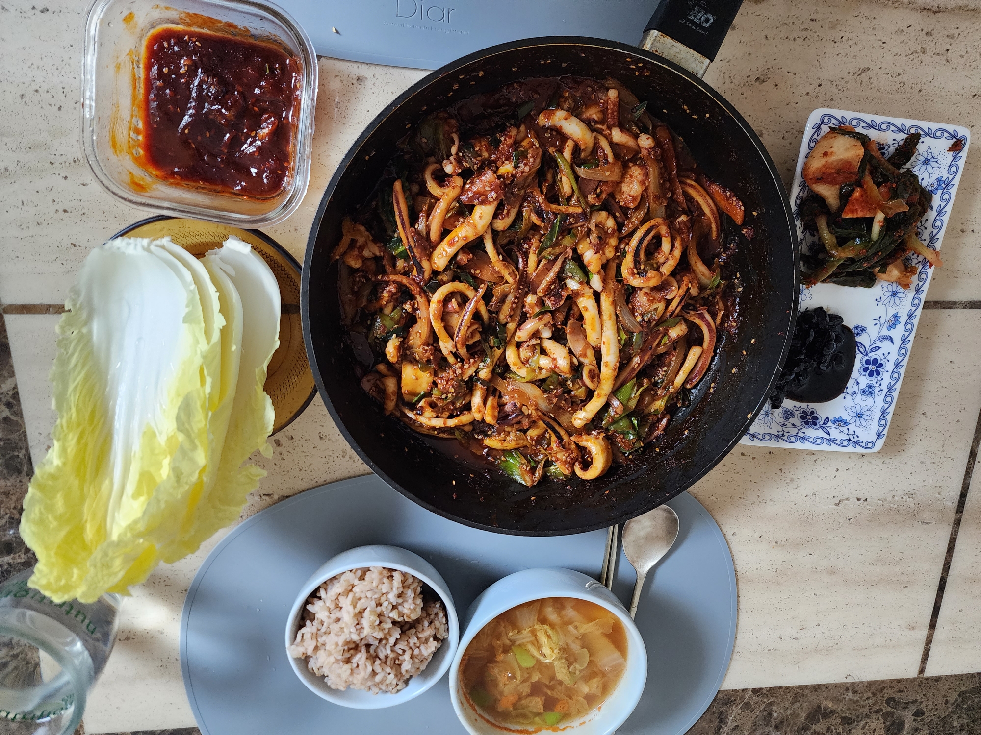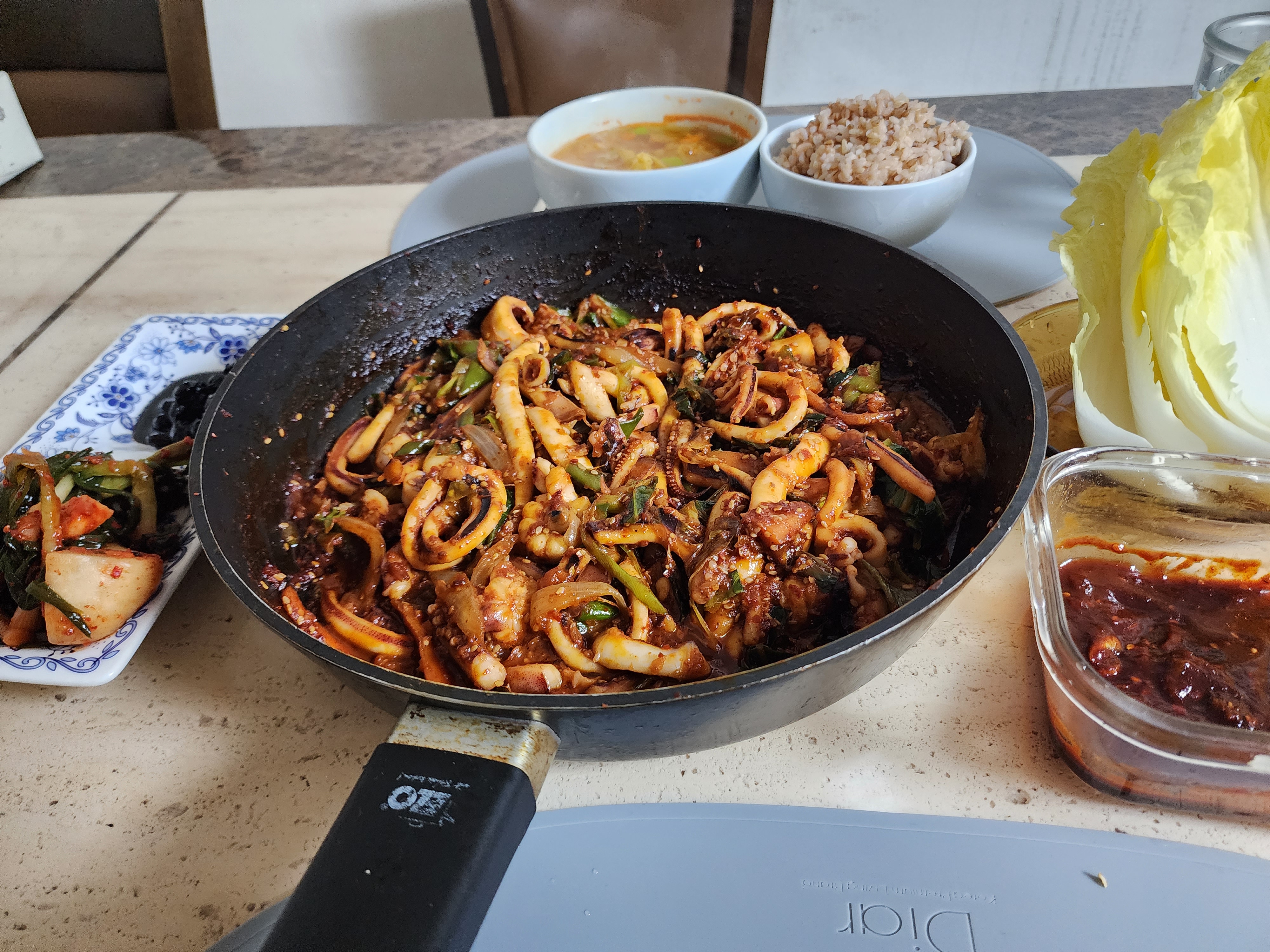 오징어볶음은 국물도 좀 나와서 국물에 비벼먹으면 너무 맛있고 배춧국은 겨울엔