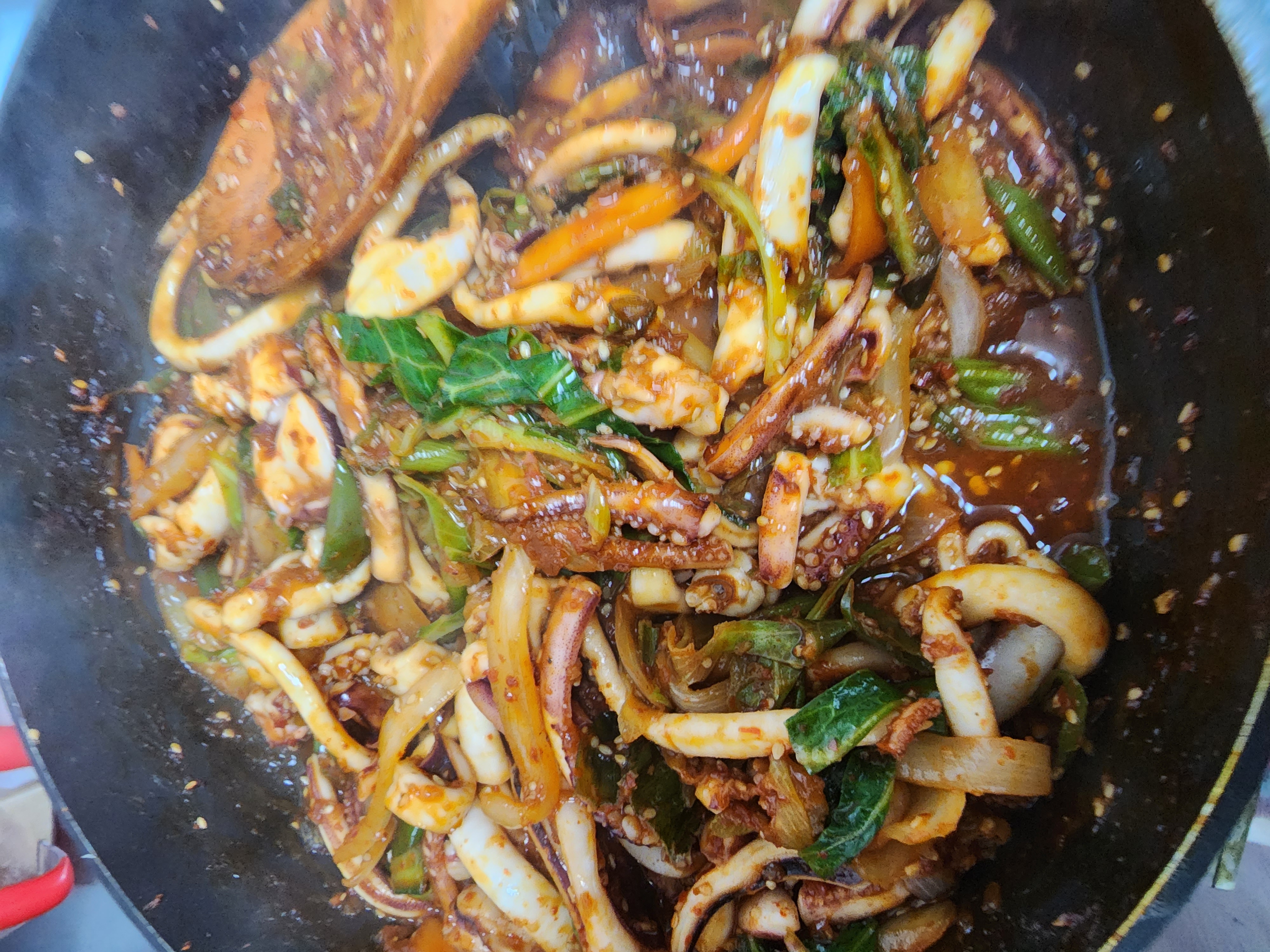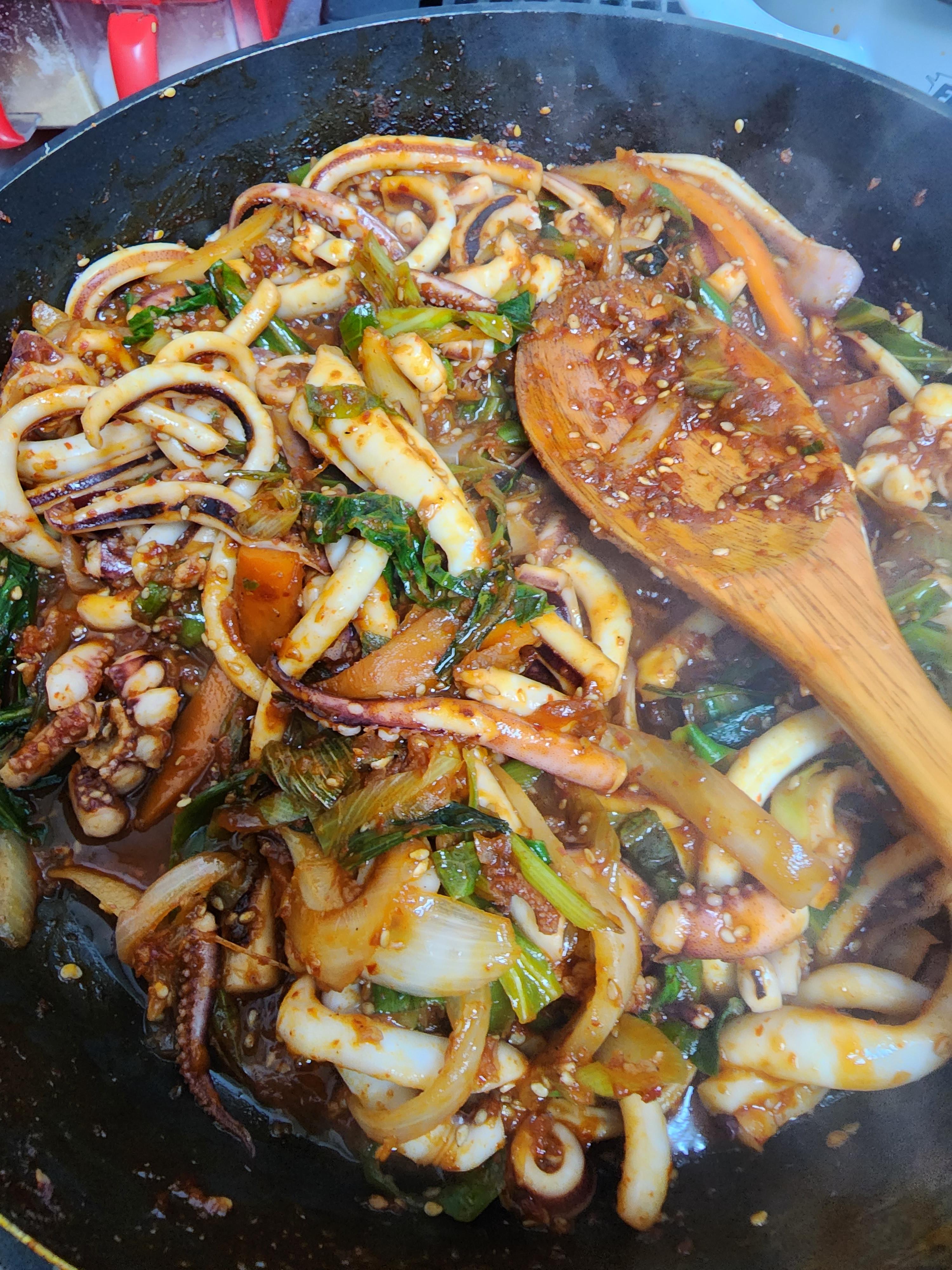 야채를 볶다가 오징어른 넣고 냉면 다대기 양념을 넣고 볶는다 간을 보니 더 넣을게