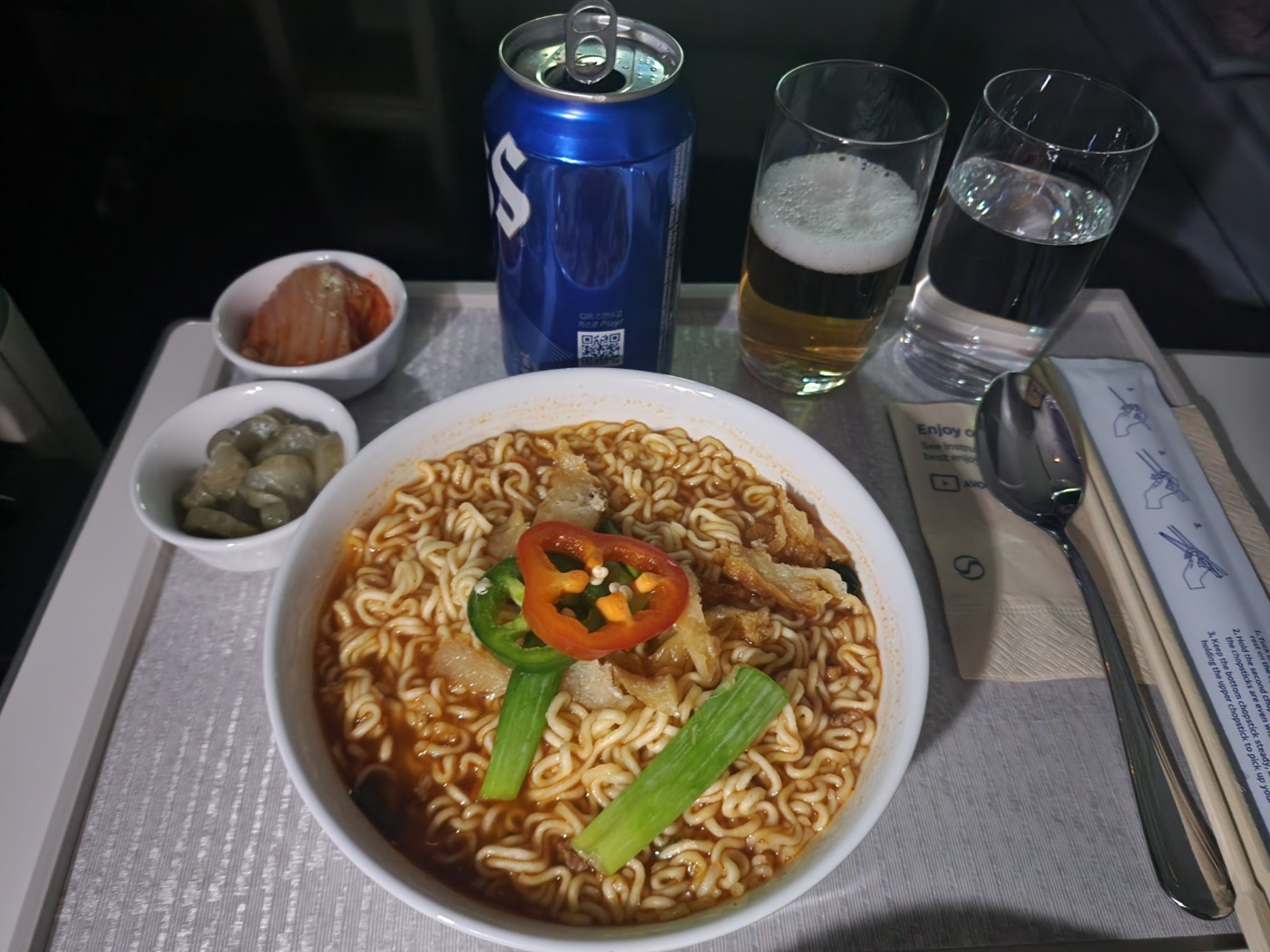 - 퍼스트 클래스에서도 원하면 라면을 주문할 수 있는데, “북어 고명 올라간 도자기 그릇 라면”은 승객들 사이에서 대한항공 시그니처 간식처럼 알려져 있어요.