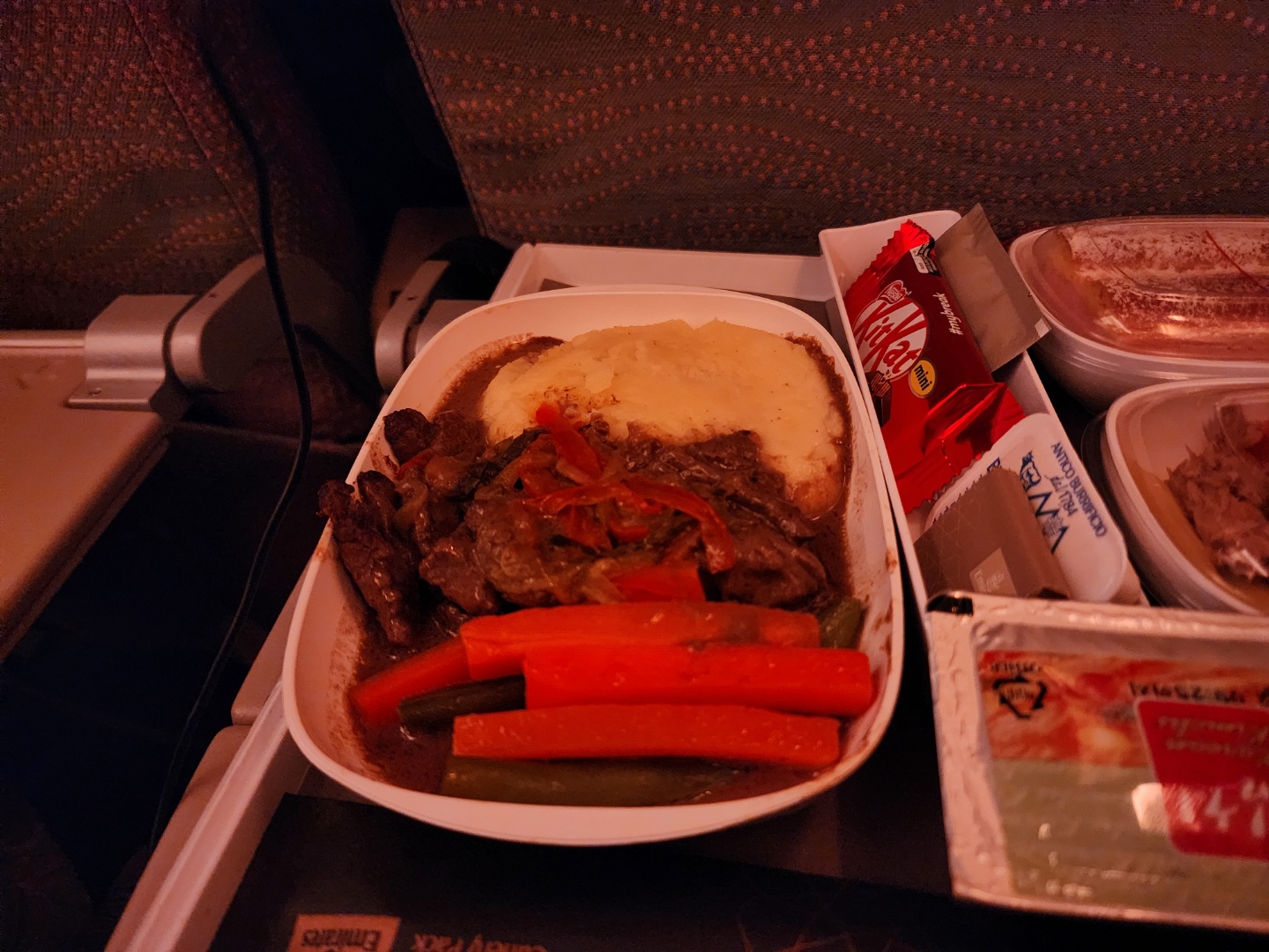 기내식이 훌륭했어요 고기도 맛있고 부드러운 감자샐러드도 그렇고 특히 디져트와 감치도 맛있고