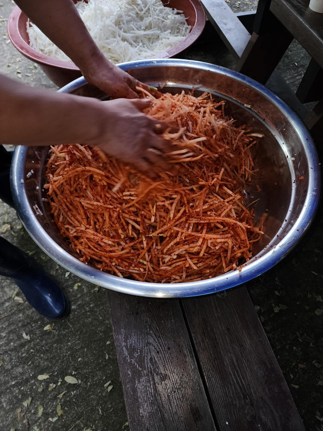 버무렸다 1차로 고춧가루를 무에 무쳐서 놓은다음 갈아놓은 양념소스를 넣고 버무리면서 액젓과 매실엑기스등을 넣는다