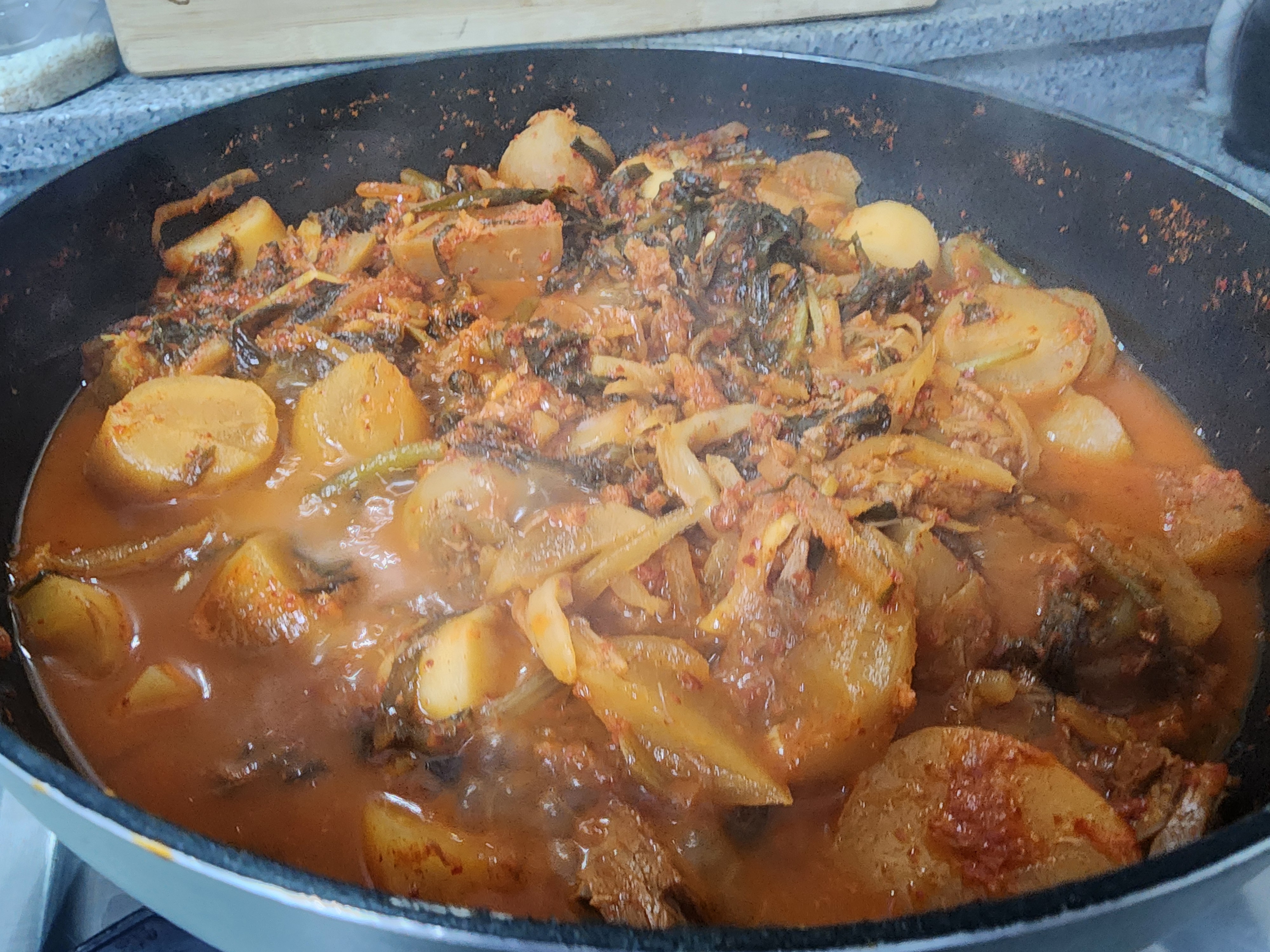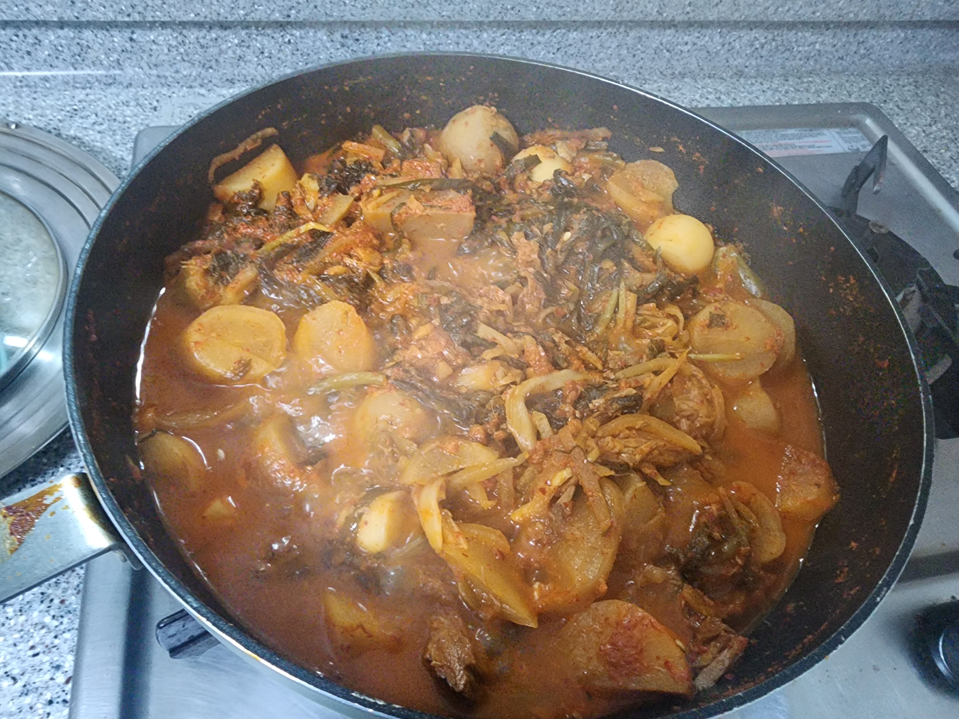 참치김치찌개에 푸익은 김치들을 정리하면서 부추김치도 같이 넣었더니 침이 고이는 김치찌개가
